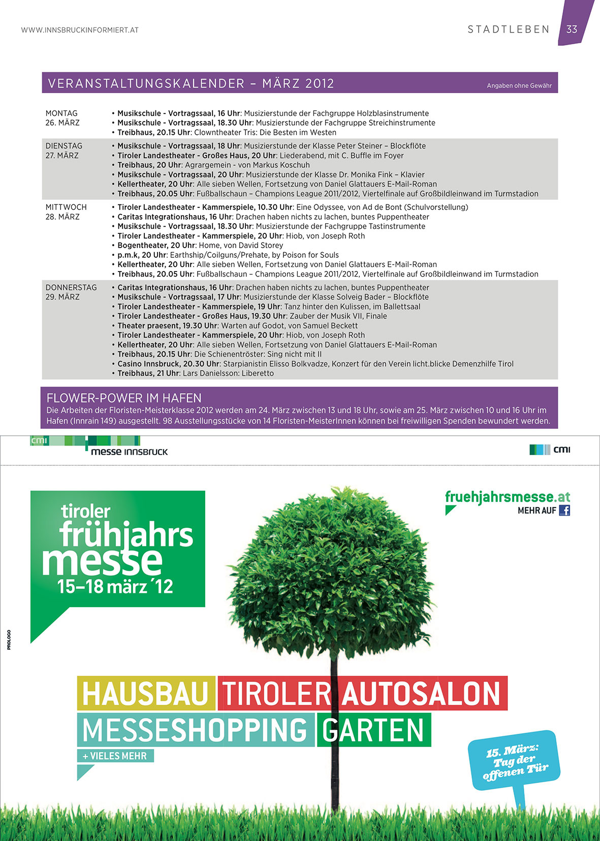 Hafen (Innrain 149) ausgestellt. 98 Ausstellungsstücke von 14 Floristen-MeisterInnen können bei freiwilligen Spenden bewundert werden.