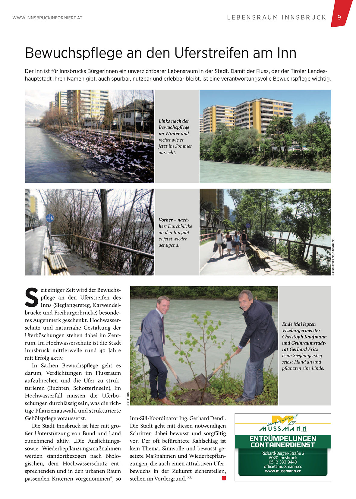 Der Inn ist für Innsbrucks BürgerInnen ein unverzichtbarer Lebensraum in der Stadt. Damit der Fluss, der der Tiroler Landeshauptstadt ihren Namen gibt, auch spürbar, nutzbar und erlebbar bleibt, ist eine verantwortungsvolle Bewuchspflege wichtig.