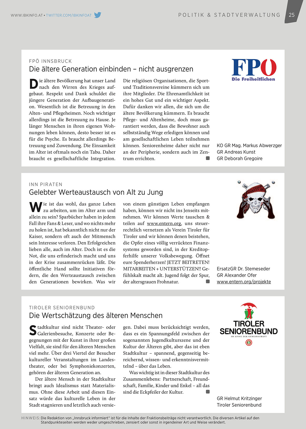 H i n w e i s : Die redaktion von „innsbruck informiert“ ist für die inhalte der fraktionsbeiträge nicht verantwortlich. Die diversen artikel auf den