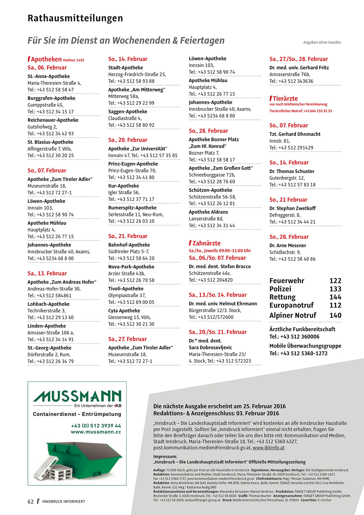Brunecker Straße 3, 6020 Innsbruck, Tel.: +43 512 58 6020 · Grafik: Thomas Bucher · Anzeigenannahme: TARGET GROUP Publishing GmbH,