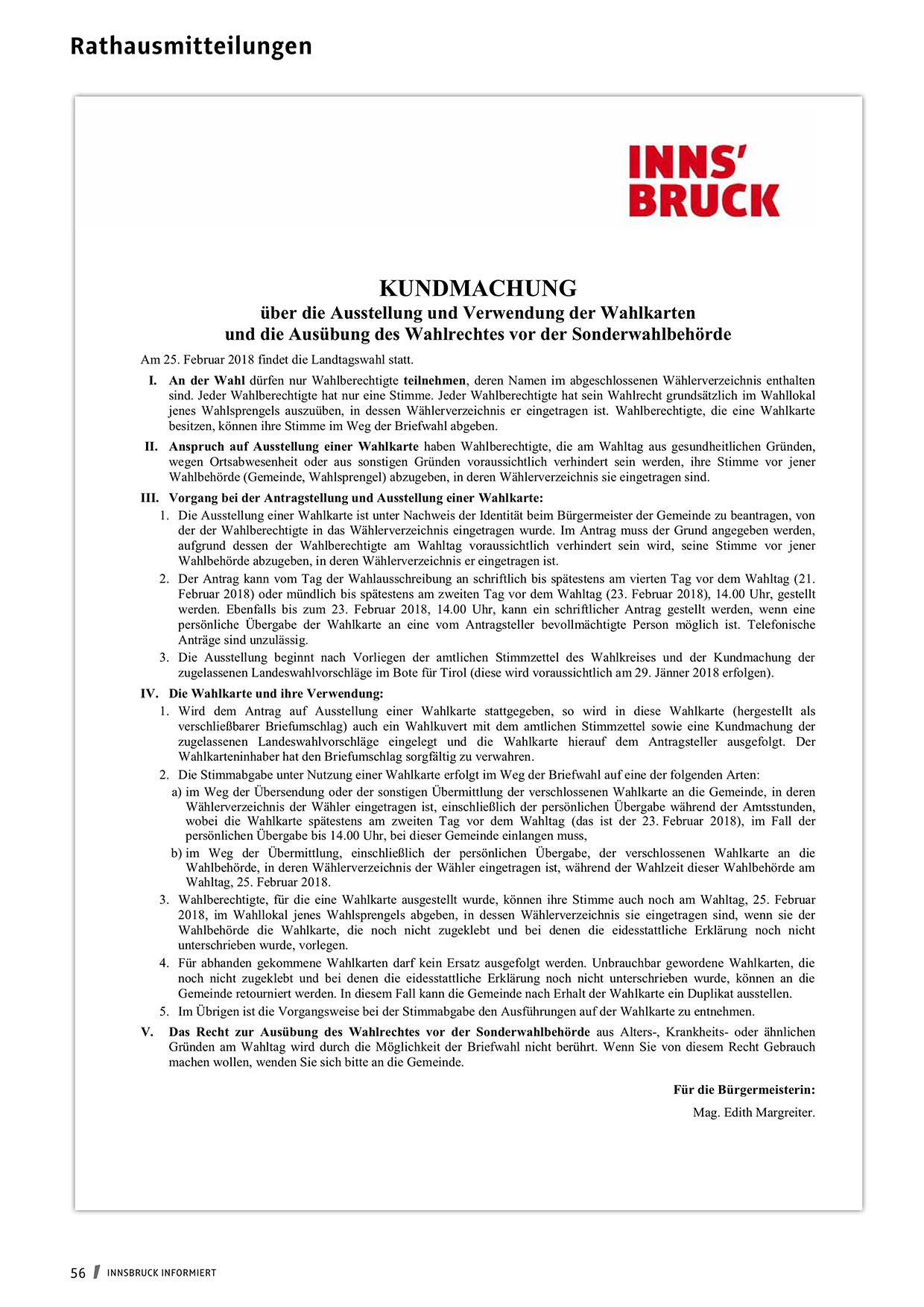 zugelassenen Landeswahlvorschläge im Bote für Tirol (diese wird voraussichtlich am 29. Jänner 2018 erfolgen).