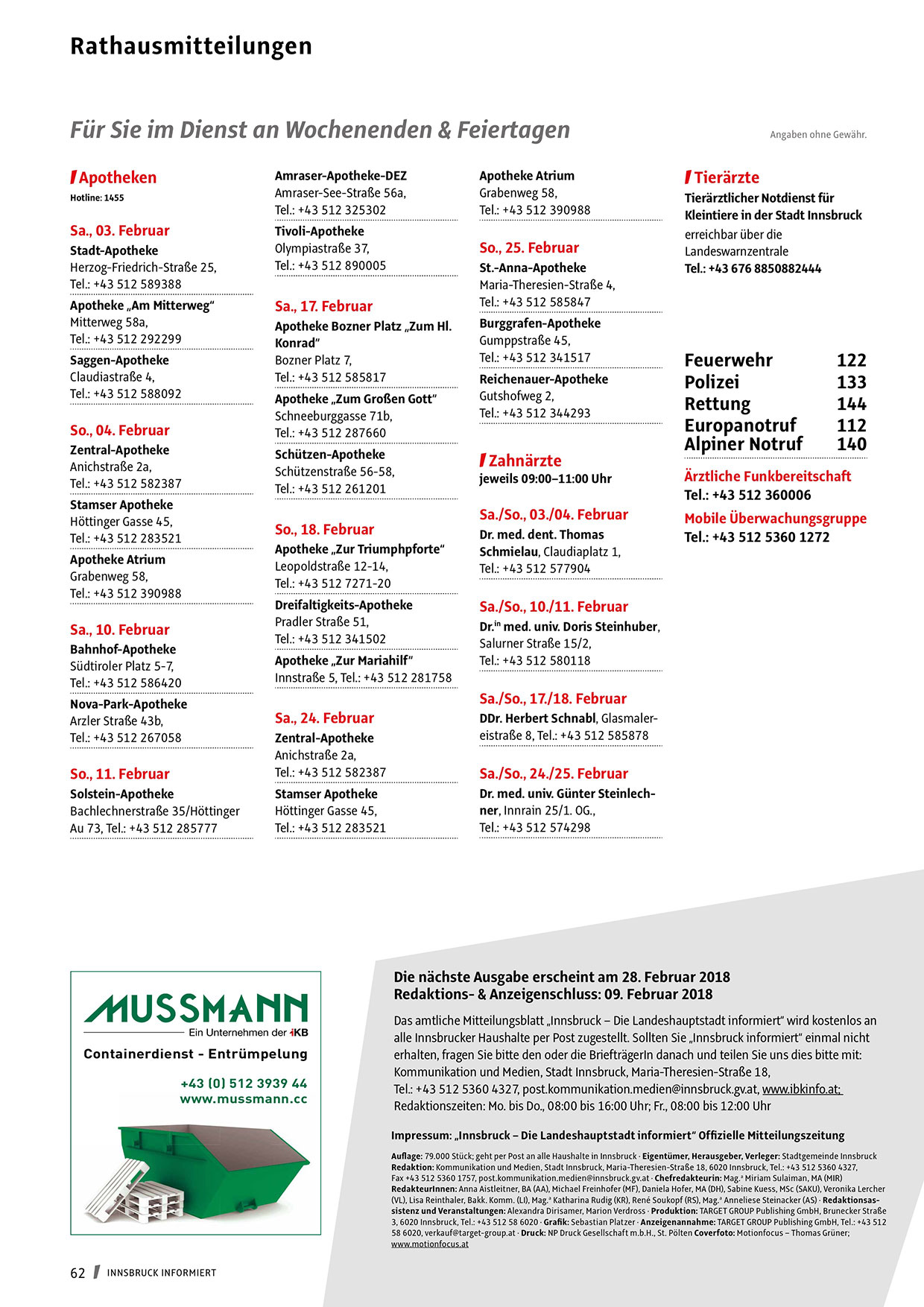 Impressum: „Innsbruck – Die Landeshauptstadt informiert“ Offizielle Mitteilungszeitung