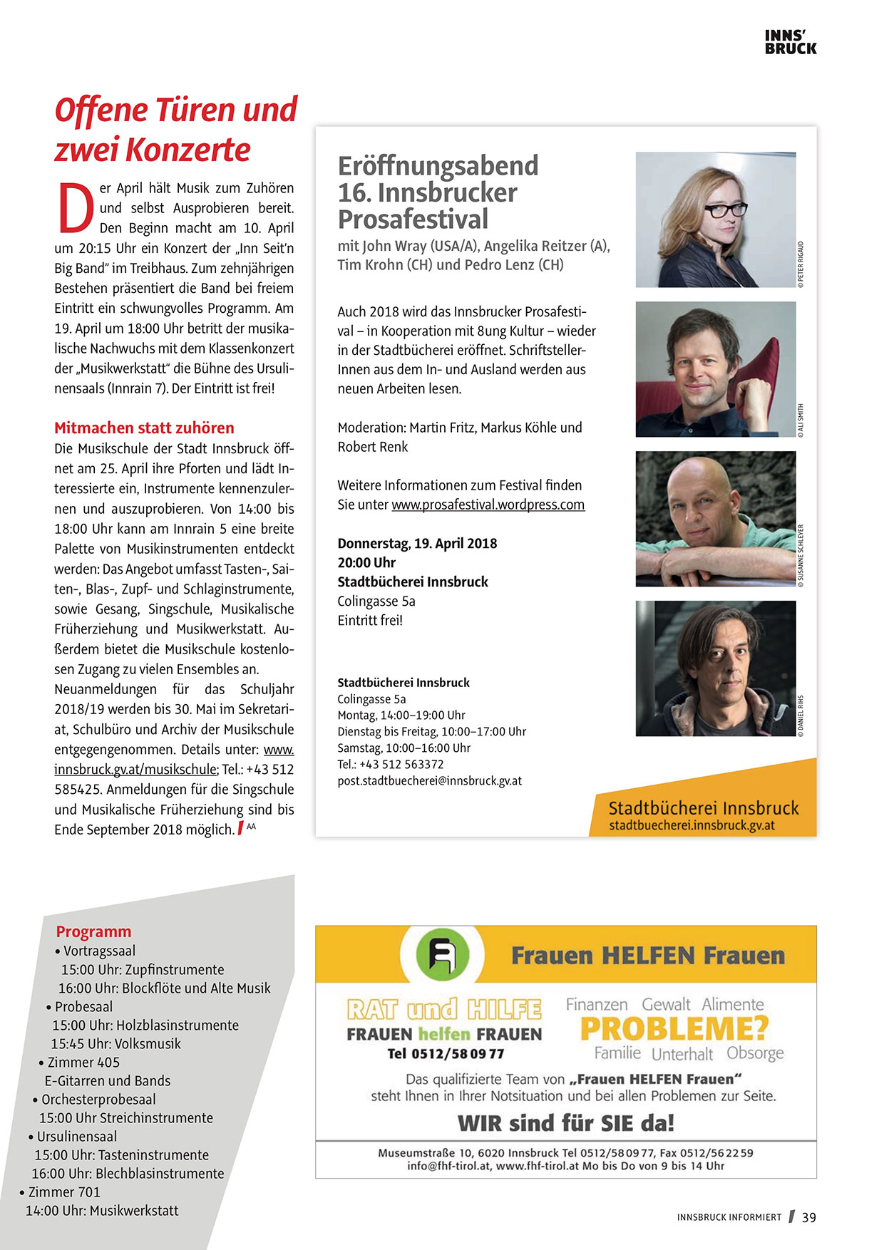 Auch 2018 wird das Innsbrucker Prosafestival – in Kooperation mit 8ung Kultur – wieder