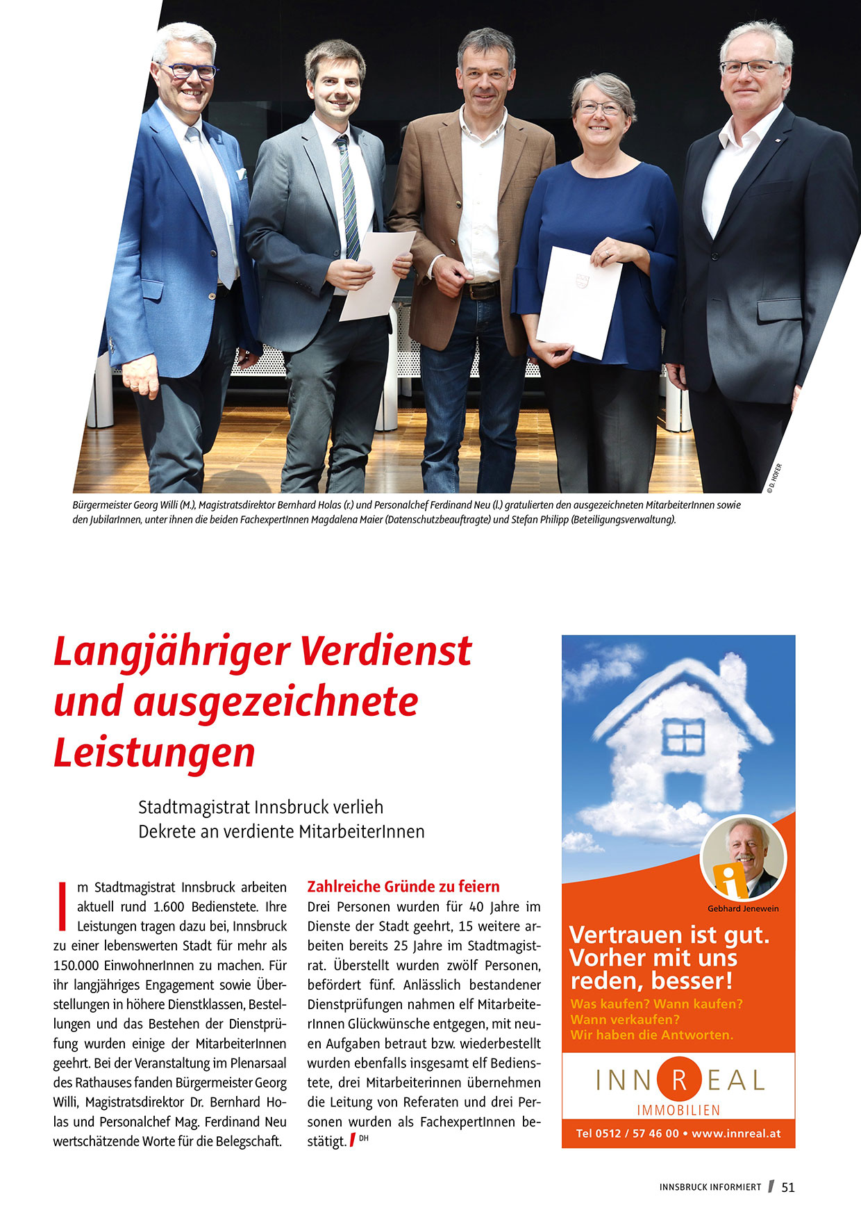 Bürgermeister Georg Willi (M.), Magistratsdirektor Bernhard Holas (r.) und Personalchef Ferdinand Neu (l.) gratulierten den ausgezeichneten MitarbeiterInnen sowie