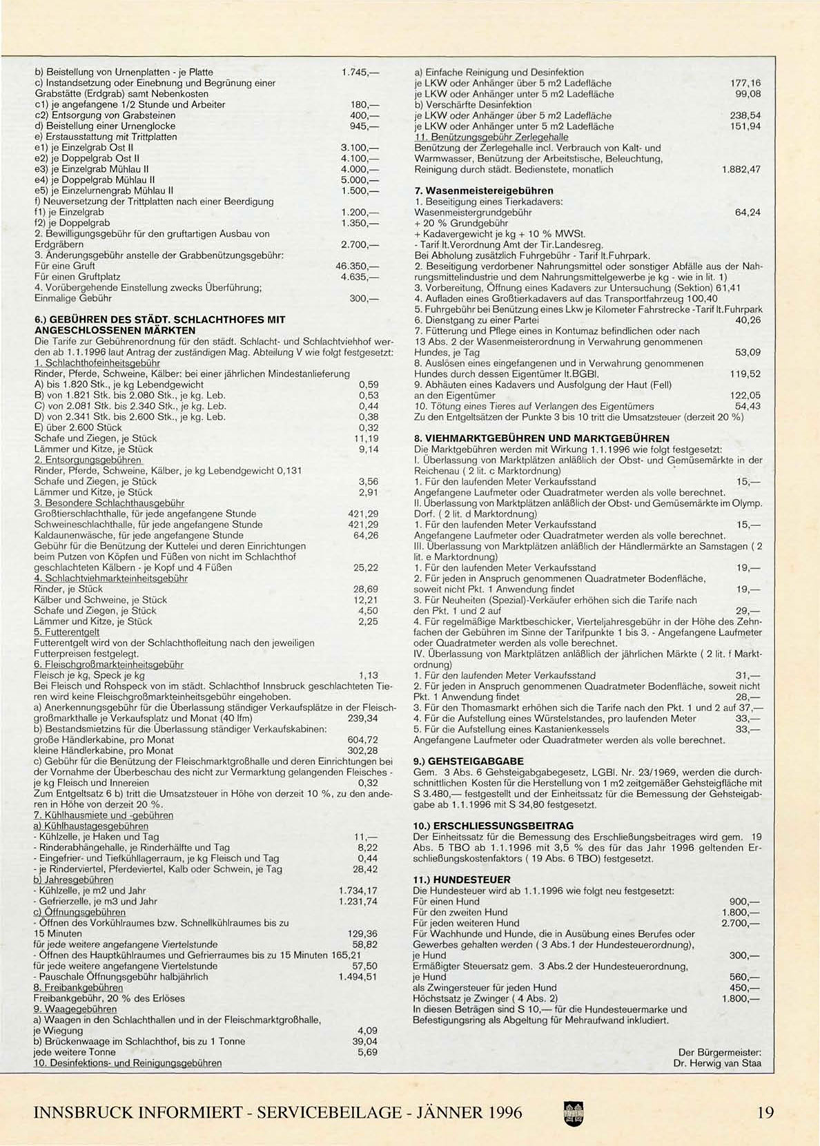 Die Tarife zur Gebührenordnung für den städt. Schlacht- und Schlachtviehhof werden ab 1.1.1996 laut Antrag der zuständigen Mag. Abteilung V wie folgt festgesetzt: