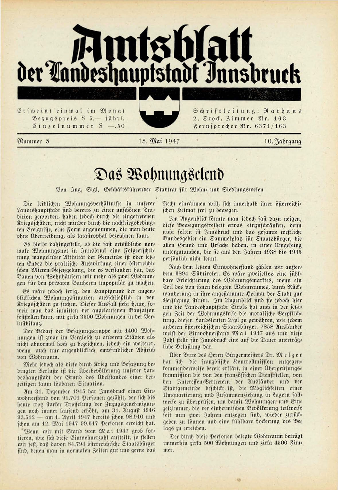 Es bleibt dahingestellt, ob die fast ortsübliche normale Wohnungsnot in Innsbruck eine Folgeerscheinung mangelnder Aktivität der Gemeinde ist oder letzten Endes die praktische Answirkuug einer österreichischen Mieten-Gesetzgebung, die es verstanden hat, das