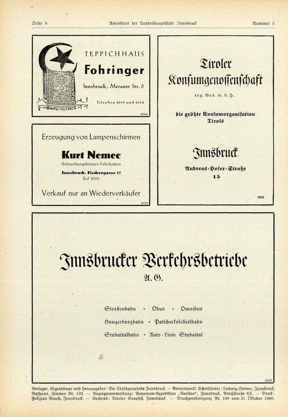 Verleger, Eigentümer und Heransgeber: Die Stadtgeiiieinde Innsbruck. — Verantwortl. Schriftleiter: Lndmig öteiner, Innsbruck,