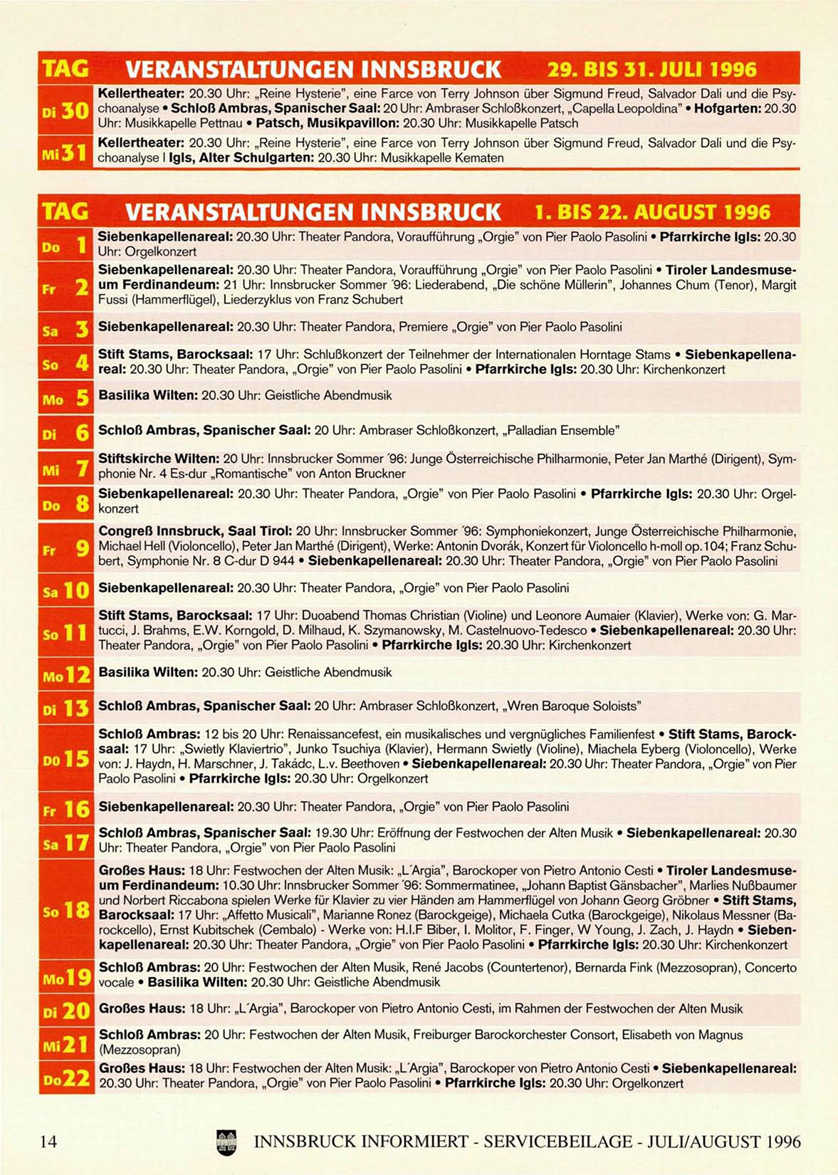 Siebenkapellenareal: 20.30 Uhr: Theater Pandora, Voraufführung „Orgie" von Pier Paolo Pasolini • Tiroler Landesmuseum Ferdinandeum: 21 Uhr: Innsbrucker Sommer "96: Liederabend, „Die schöne Müllerin", Johannes Chum (Tenor), Margit