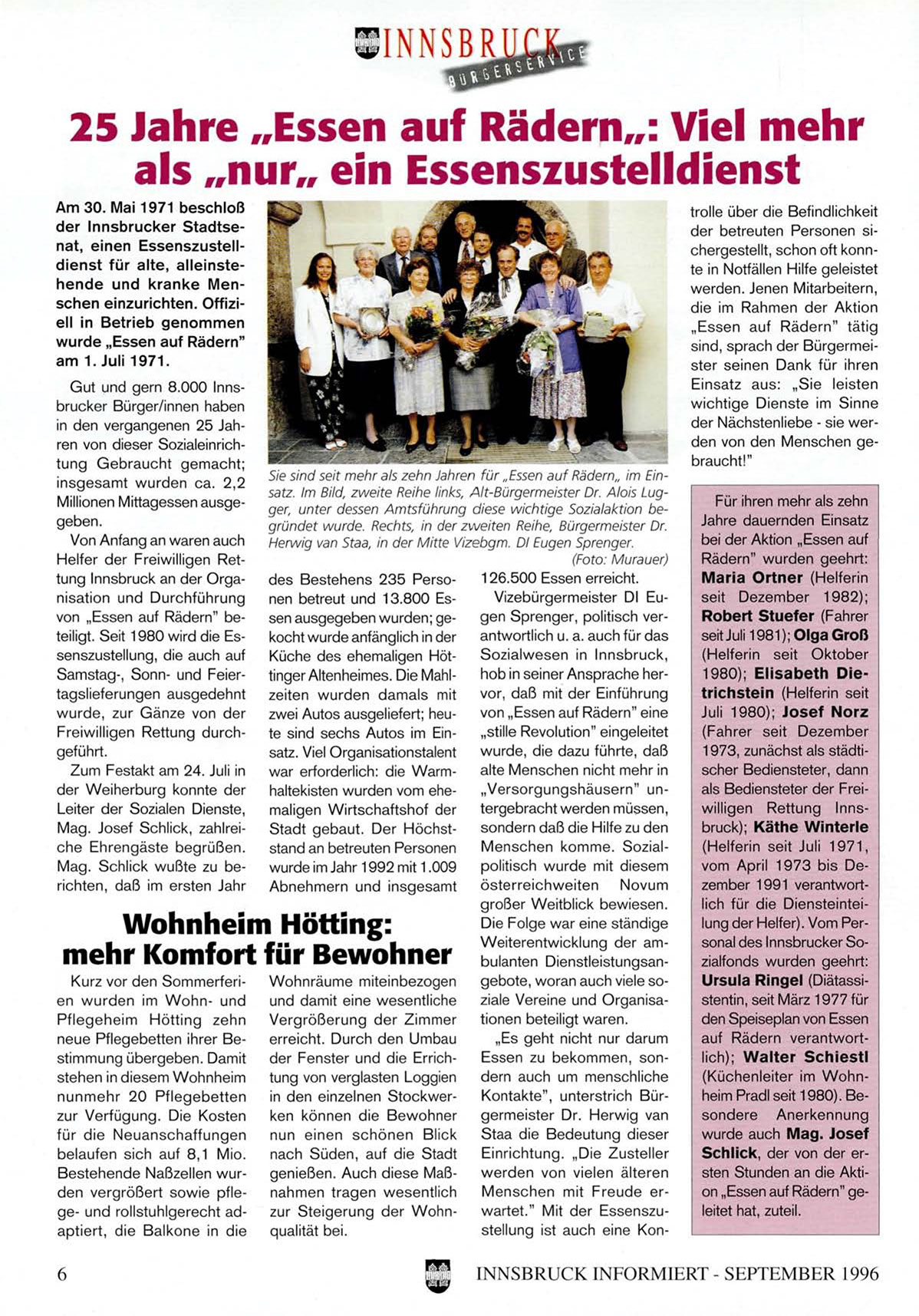 vom April 1973 bis Dezember 1991 verantwortlich für die Diensteinteilung der Helfer). Vom Personal des Innsbrucker Sozialfonds wurden geehrt: