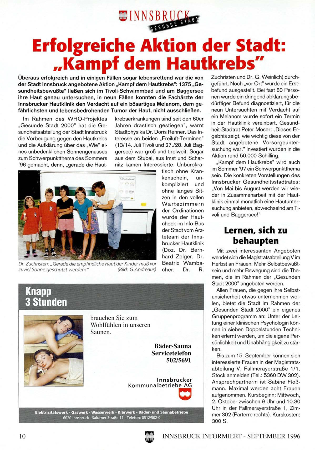 der Stadt Innsbruck angebotene Aktion „Kampf dem Hautkrebs": 1375 „Gesundheitsbewußte" ließen sich im Tivoli-Schwimmbad und am Baggersee