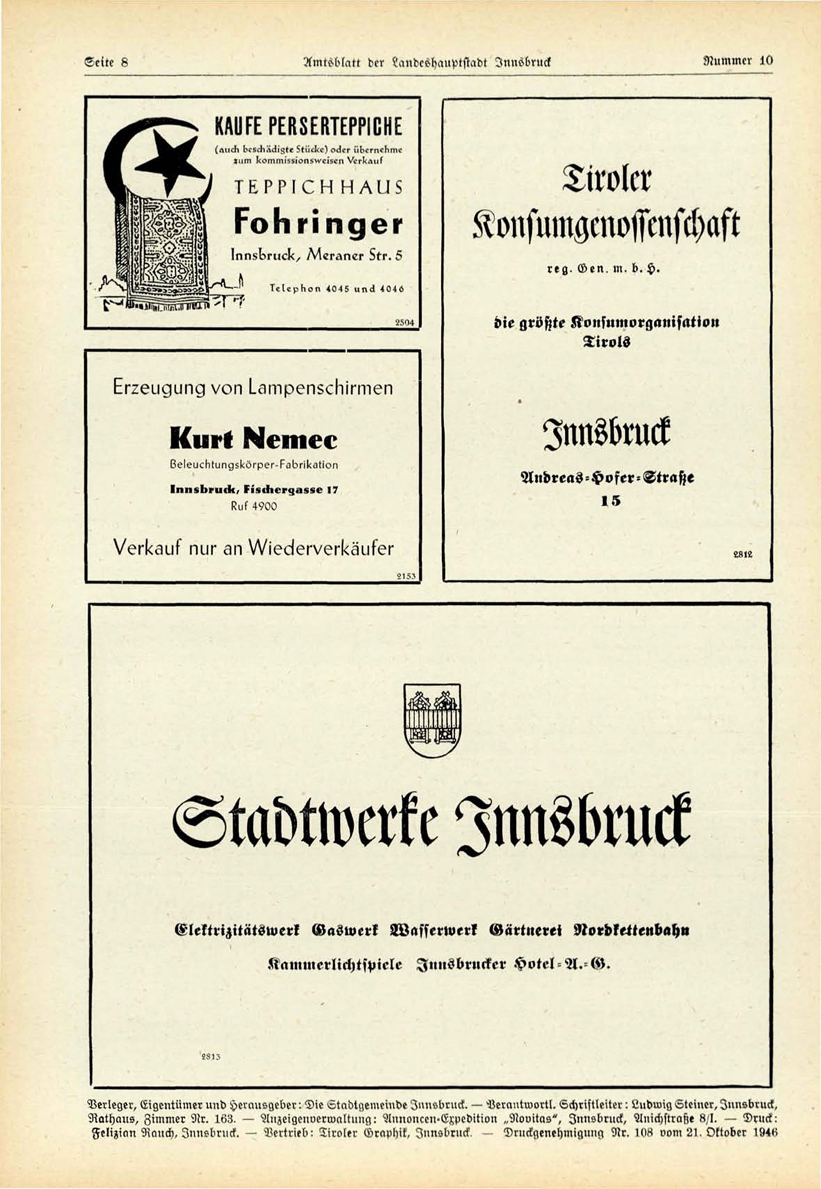 Rathaus, Zimmer Älr. 163. — Anzeigoiwerwaltuug: Annoucen-Expedition „Nouitas", Innsbruck, Anichstraße «,I. — Druck: