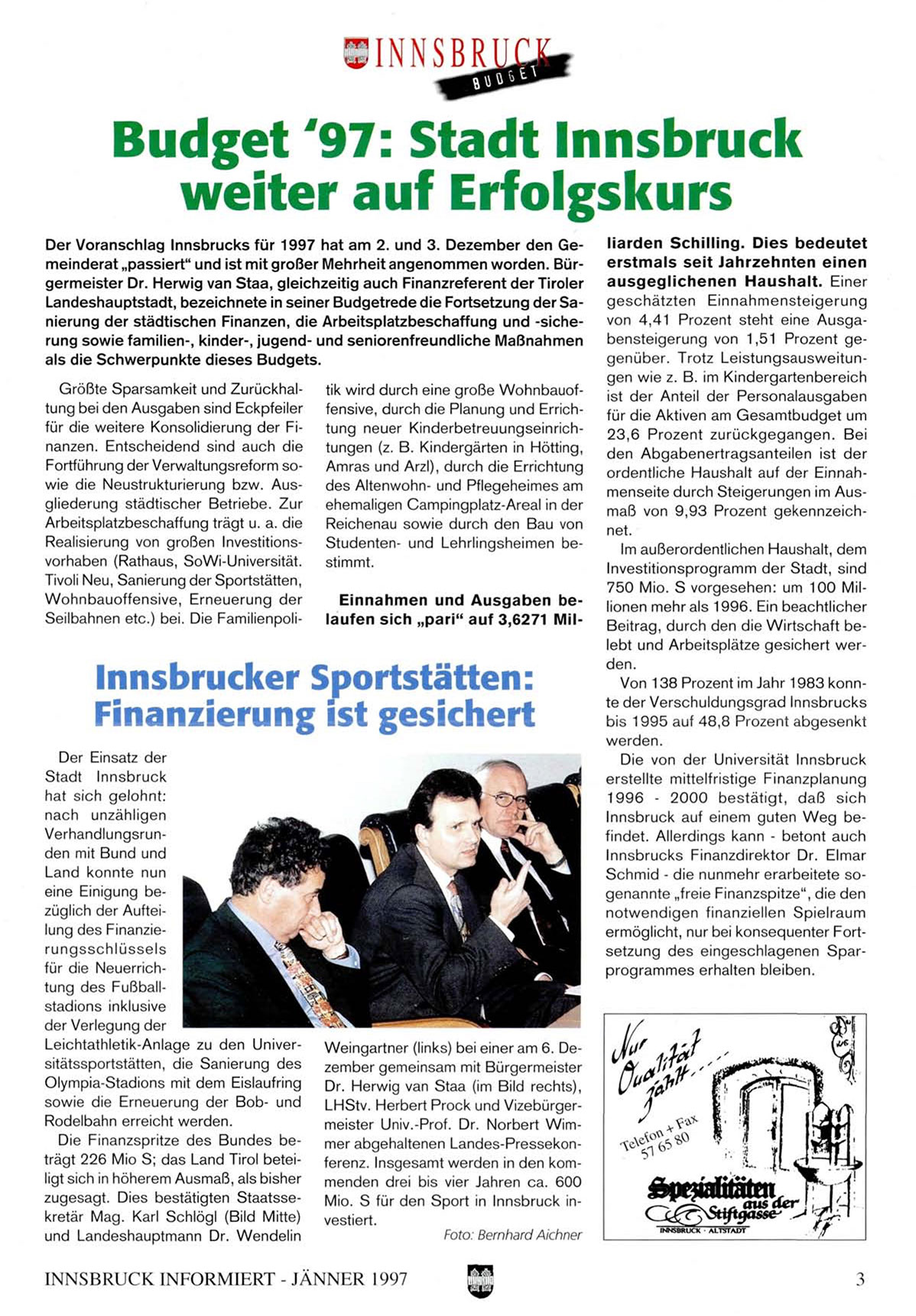 Der Voranschlag Innsbrucks für 1997 hat am 2. und 3. Dezember den Gemeinderat „passiert" und ist mit großer Mehrheit angenommen worden. Bürgermeister Dr. Herwig van Staa, gleichzeitig auch Finanzreferent der Tiroler