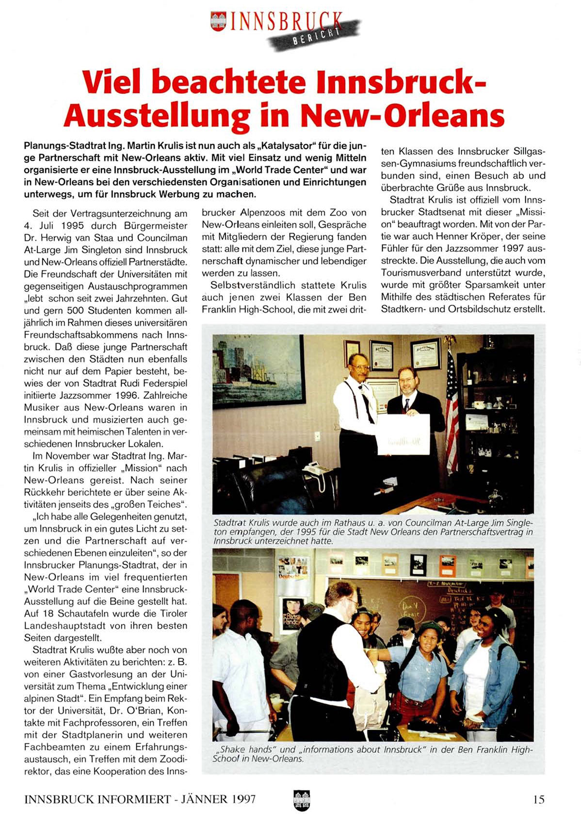 Stadtrat Krulis wurde auch im Rathaus u. a. von Councilman At-Large Jim Singleton empfangen, der 1995 für die Stadt New Orleans den Partnerschaftsvertrag in