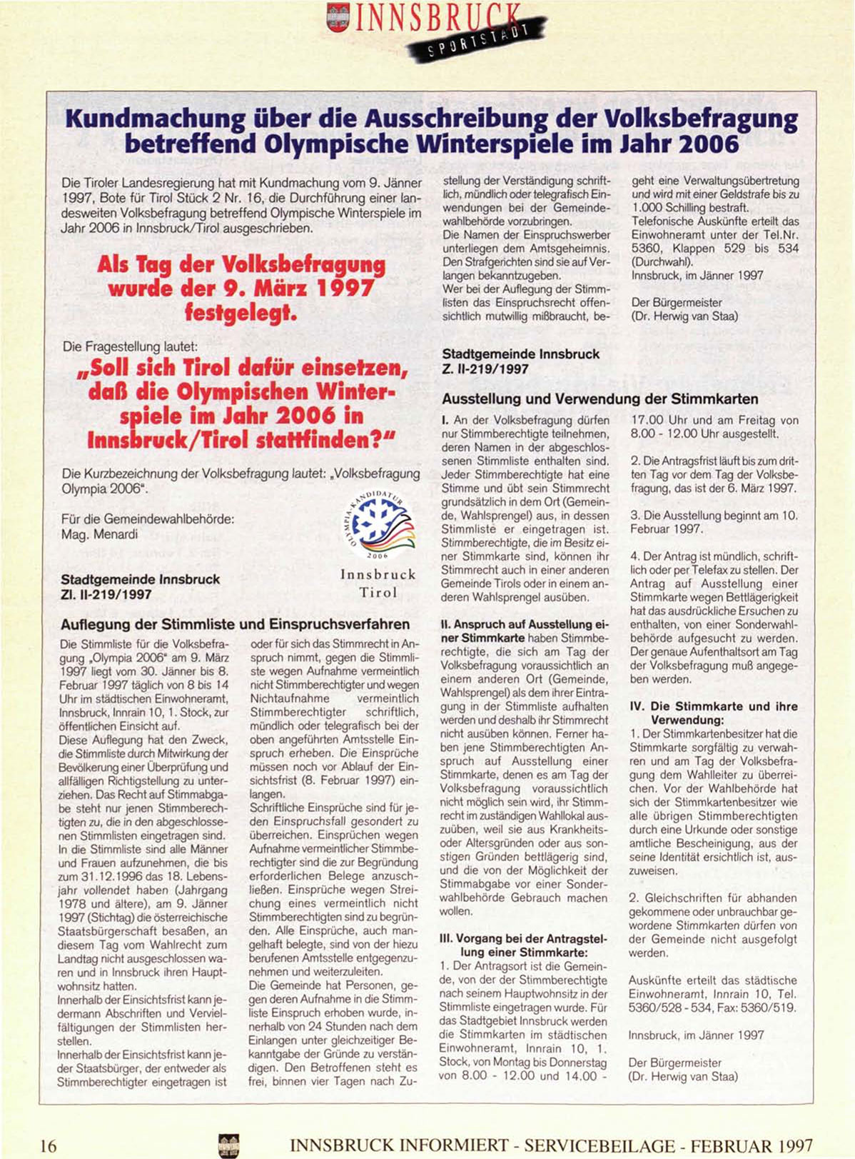 1997, Bote für Tirol Stück 2 Nr. 16, die Durchführung einer landesweiten Volksbefragung betreffend Olympische Winterspiele im