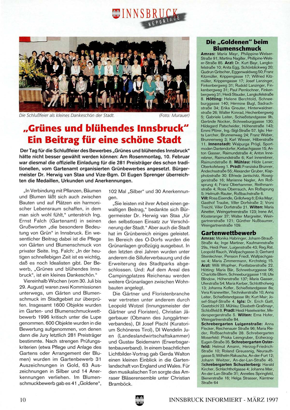 war diesmal die offizielle Einladung für die 281 Preisträger des schon traditionellen, vom Gartenamt organisierten Grünbewerbes angesetzt. Bürgermeister Dr. Herwig van Staa und Vize-Bgm. DI Eugen Sprenger überreichten die Medaillen, Urkunden und Anerkennungen.