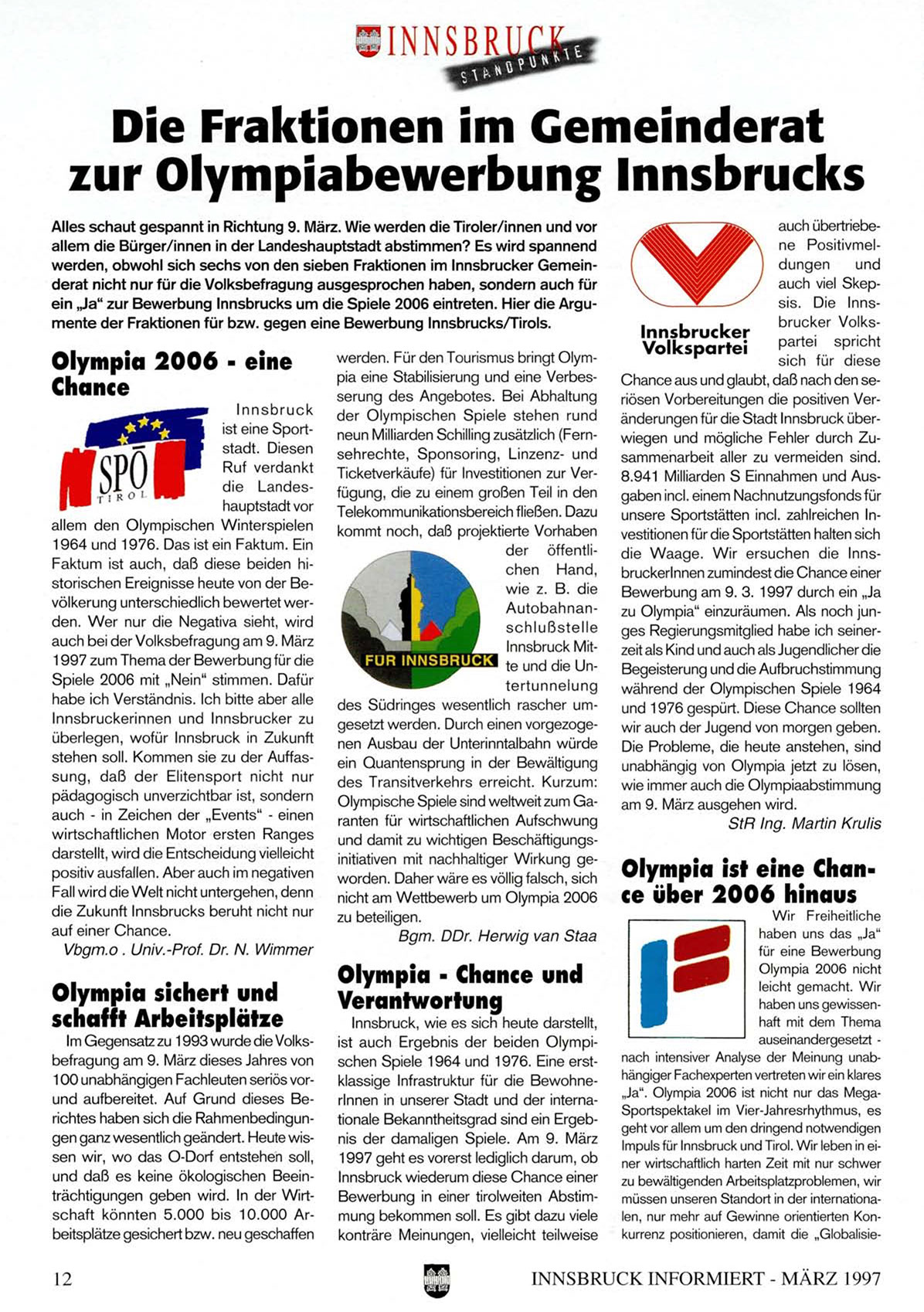 ein „Ja" zur Bewerbung Innsbrucks um die Spiele 2006 eintreten. Hier die Argumente der Fraktionen für bzw. gegen eine Bewerbung Innsbrucks/Tirols.