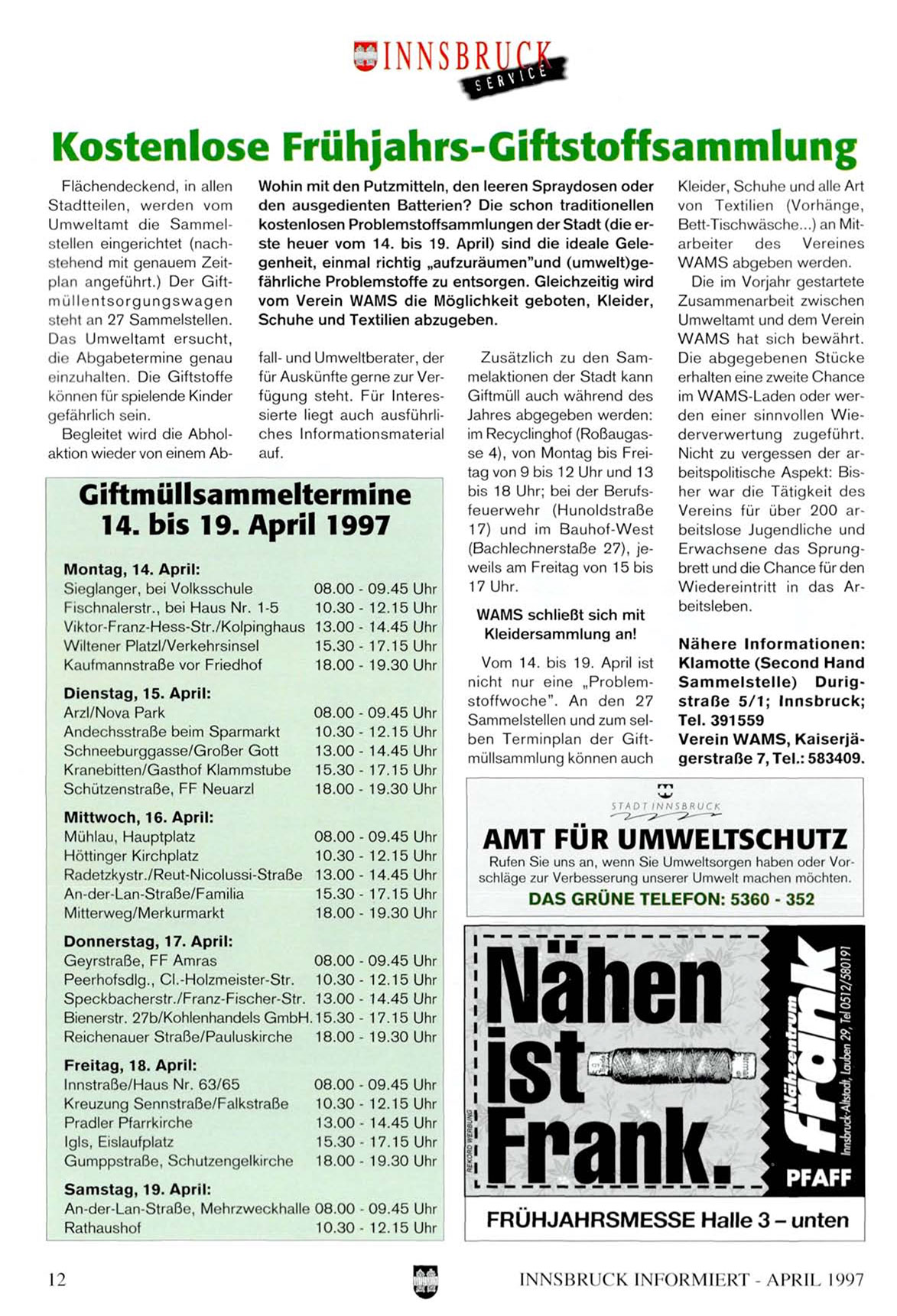 Verein WAMS, Kaiserjägerstraße 7, Tel.: 583409.