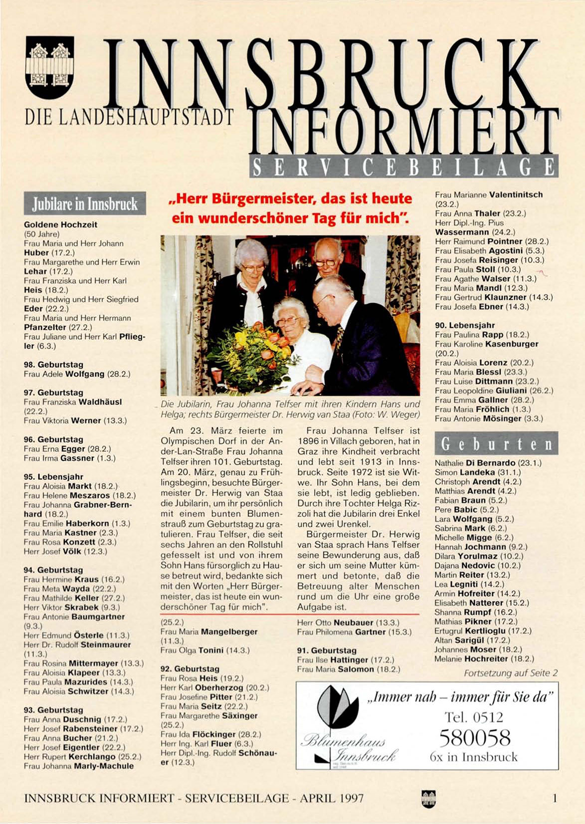mit einem bunten Blumenstrauß zum Geburtstag zu gratulieren. Frau Telfser, die seit