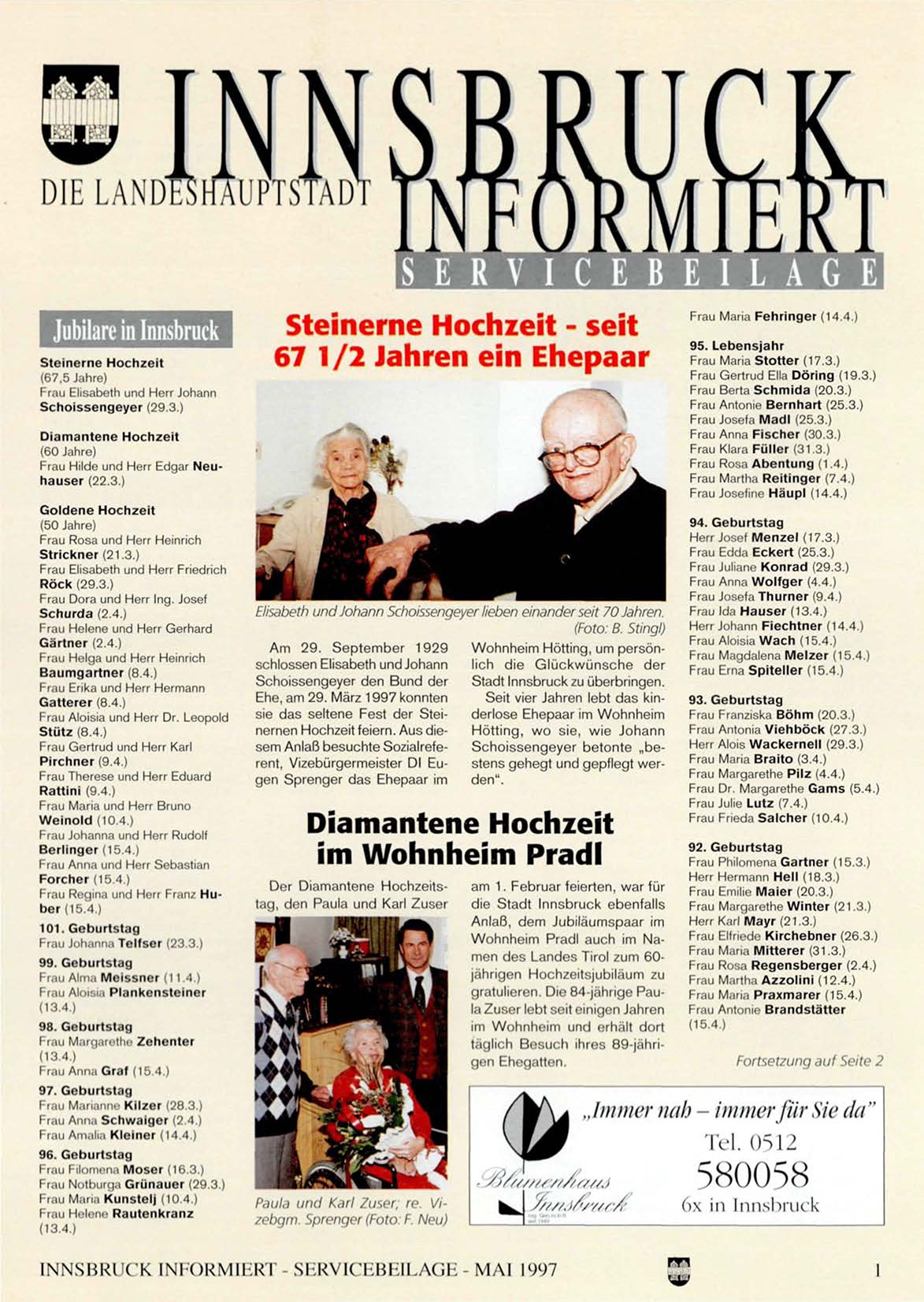 Wohnheim Pradl auch im Namen des Landes Tirol zum 60jährigen Hochzeitsjubiläum zu
