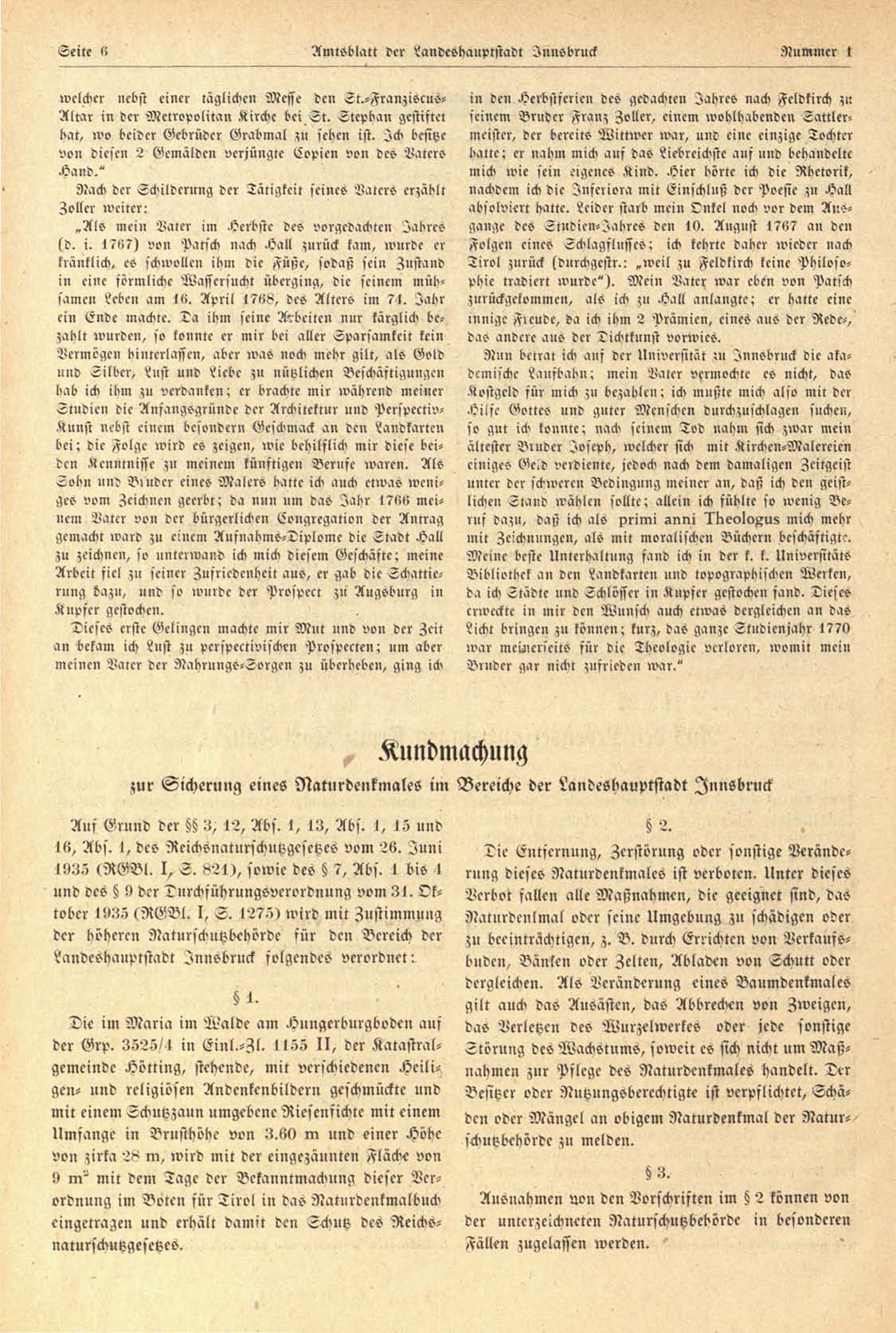 zur Sicherung eines Naturdenkmales im Bereiche der Landeshauptstadt Innsbruck
