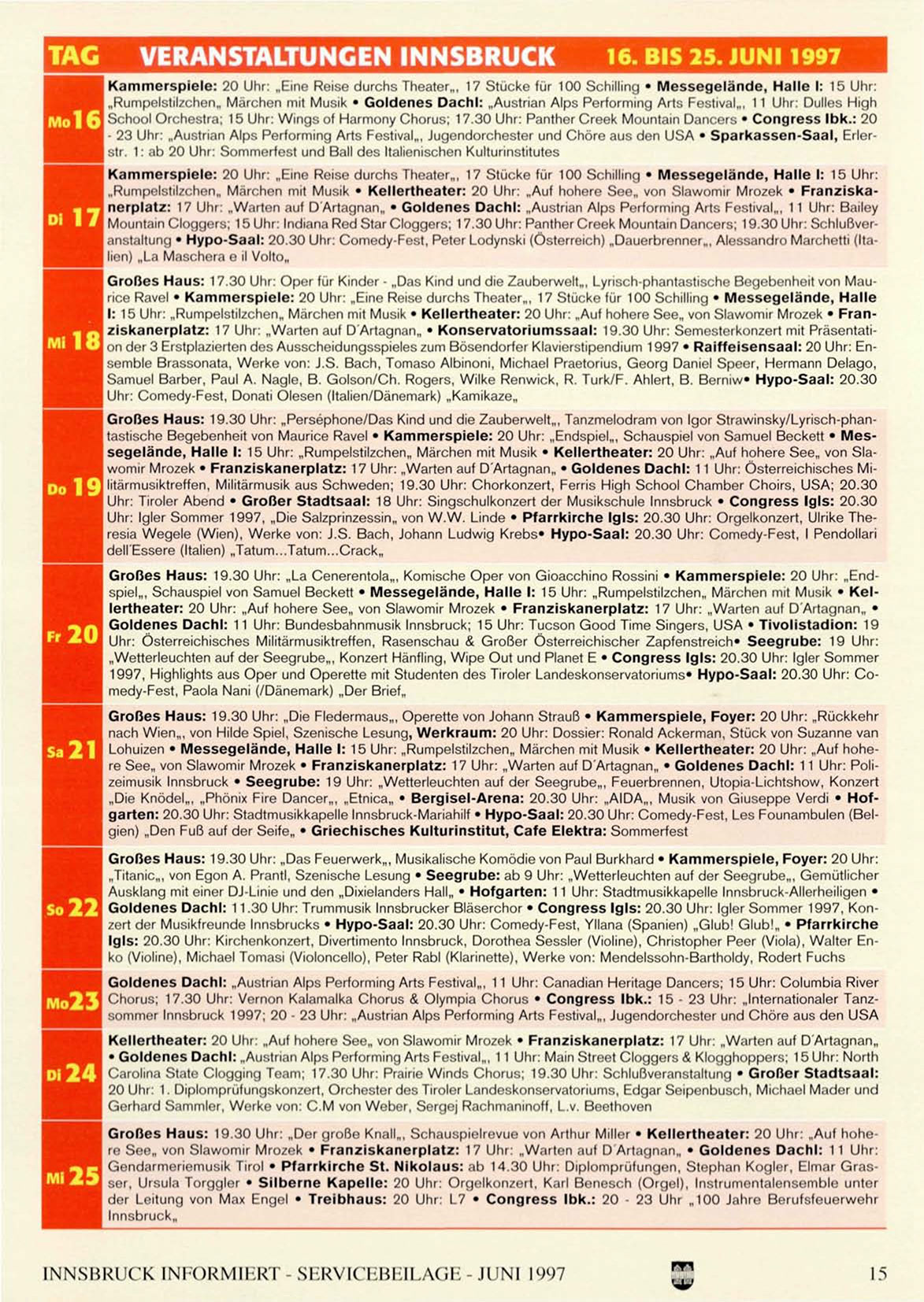Goldenes Dachl: 11.30 Uhr: Trummusik Innsbrucker Bläserchor • Congress Igls: 20.30 Uhr: Igler Sommer 1997, Konzert der Musikfreunde Innsbrucks • Hypo-Saal: 20.30 Uhr: Comedy-Fest, Yllana (Spanien) „Glub! Glub!„ • Pfarrkirche