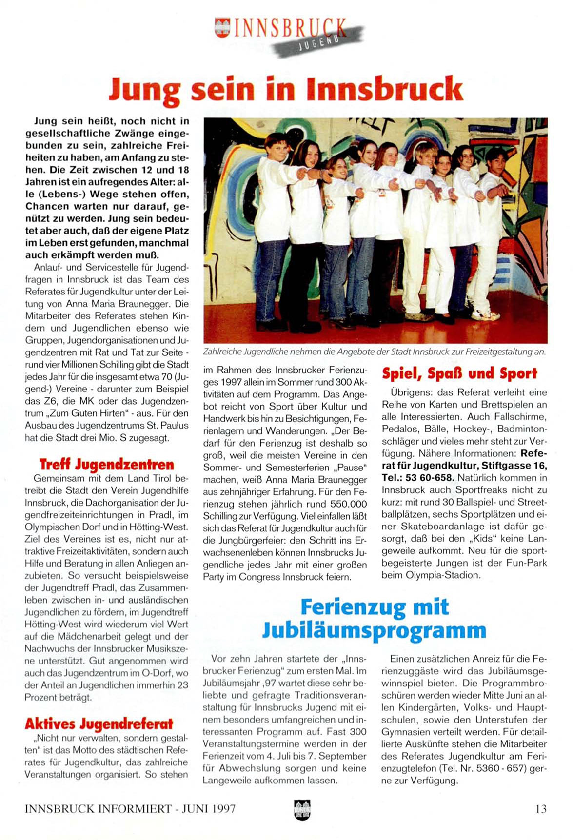 im Rahmen des Innsbrucker Ferienzuges 1997 allein im Sommer rund 300 Aktivitäten auf dem Programm. Das Angebot reicht von Sport über Kultur und