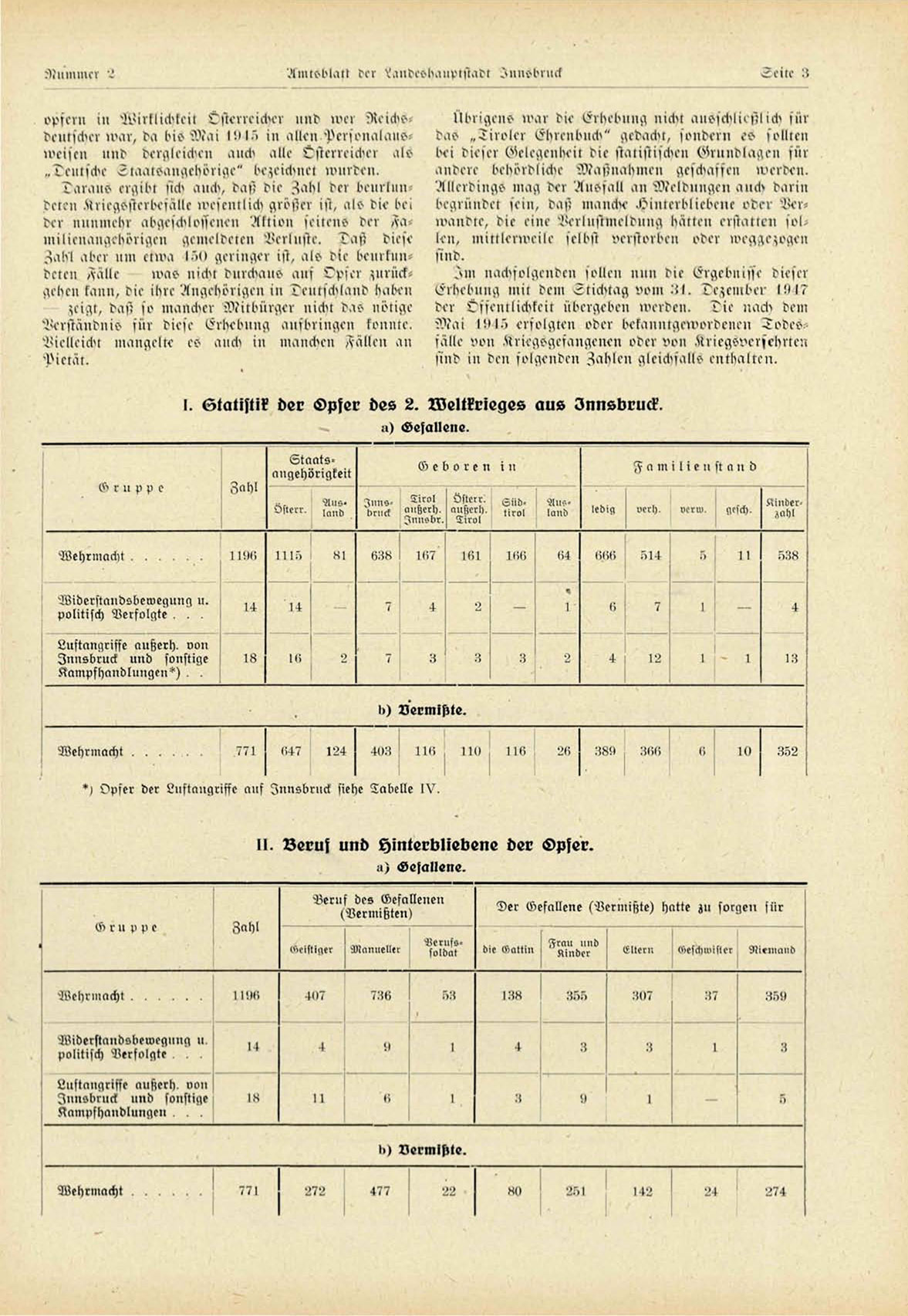l. Statistik der Opfer des 2. Weltkrieges aus Innsbruck.