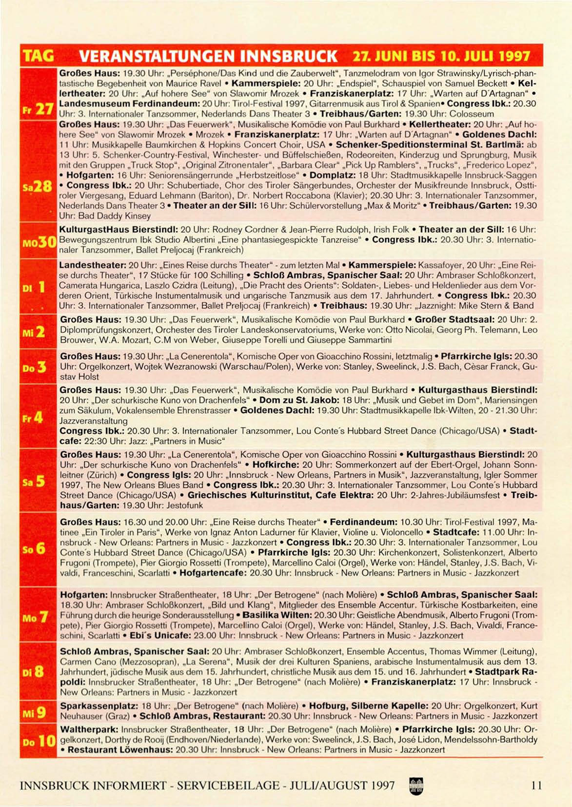 Großes Haus: 16.30 und 20.00 Uhr: „Eine Reise durchs Theater" • Ferdinandeum: 10.30 Uhr: Tirol-Festival 1997, Matinee „Ein Tiroler in Paris", Werke von Ignaz Anton Ladurner für Klavier, Violine u. Violoncello • Stadtcafe: 11.00 Uhr: Innsbruck - New Orleans: Partners in Music - Jazzkonzert • Congress Ibk.: 20.30 Uhr: 3. Internationaler Tanzsommer, Lou