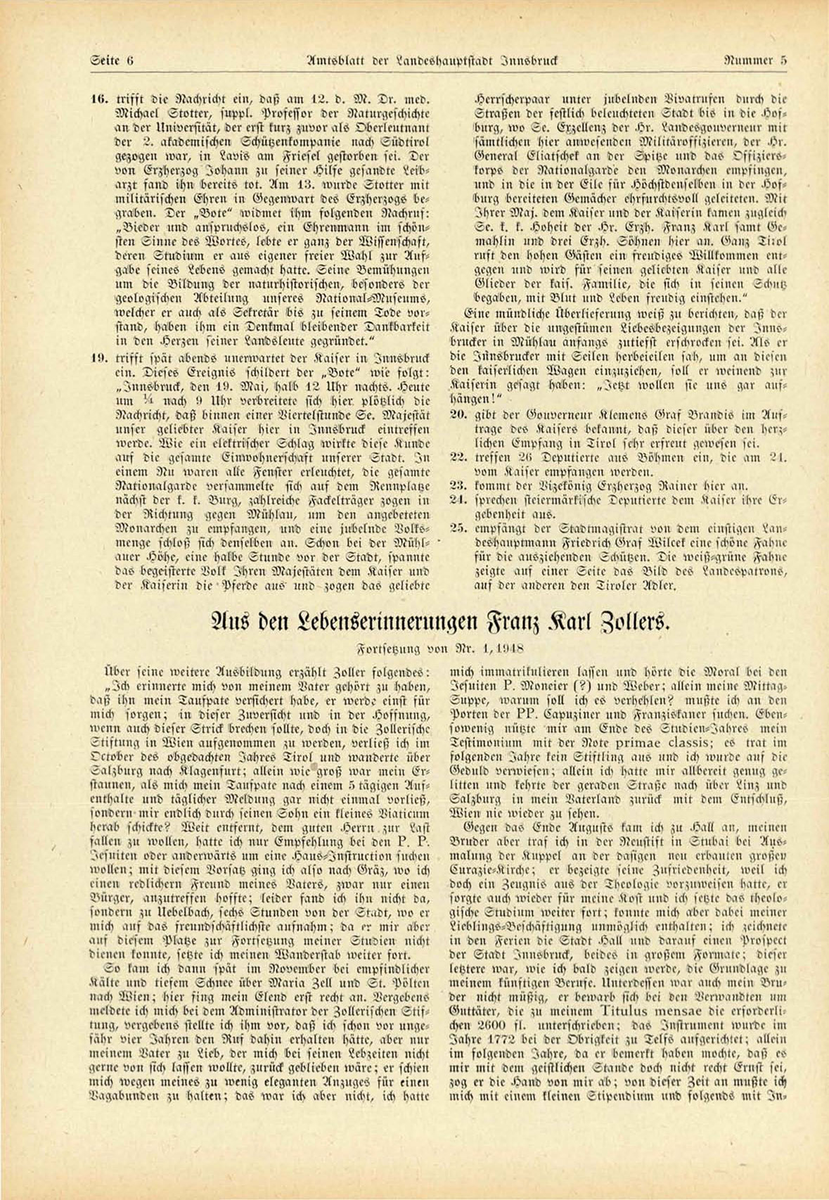 20. gibt der Gouverneur Kloiueuo Gras Bianoio im Austrage des Kaisers bekannt, daß dieser über den herzlichen Empfang in T i r o l sc"hr erfreut gewesen sei.