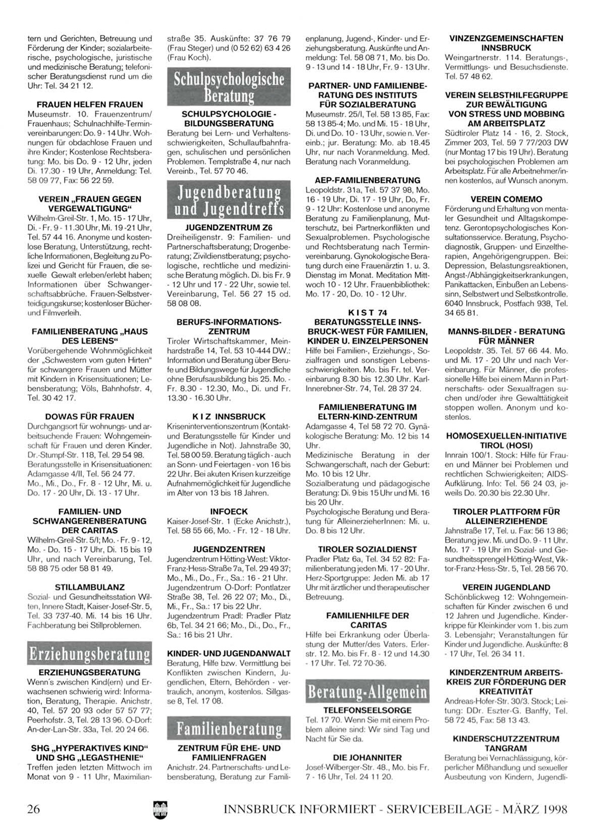 Pradler Platz 6a, Tel. 34 52 82: Familienberatung jeden Mi. 17 - 20 Uhr.
