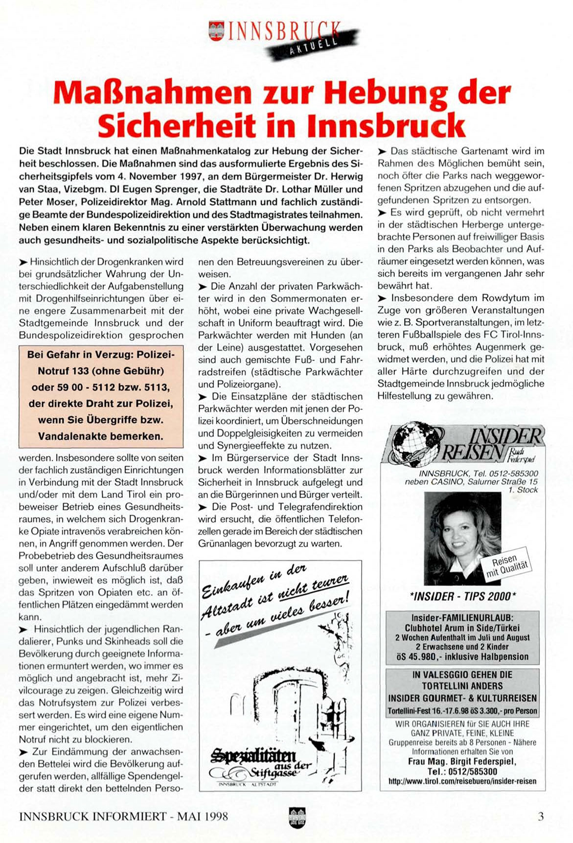 Die Stadt Innsbruck hat einen Maßnahmenkatalog zur Hebung der Sicherheit beschlossen. Die Maßnahmen sind das ausformulierte Ergebnis des Sicherheitsgipfels vom 4. November 1997, an dem Bürgermeister Dr. Herwig