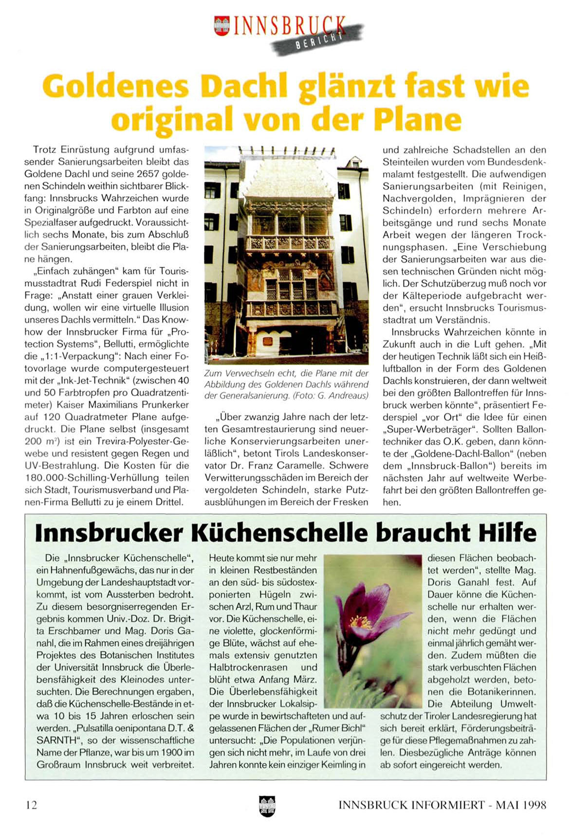 „Über zwanzig Jahre nach der letz„Super-Werbeträger". Sollten Ballonten Gesamtrestaurierung sind neuerliche Konservierungsarbeiten uner- techniker das O.K. geben, dann könnläßlich", betont Tirols Landeskonser- te der „Goldene-Dachl-Ballon" (neben