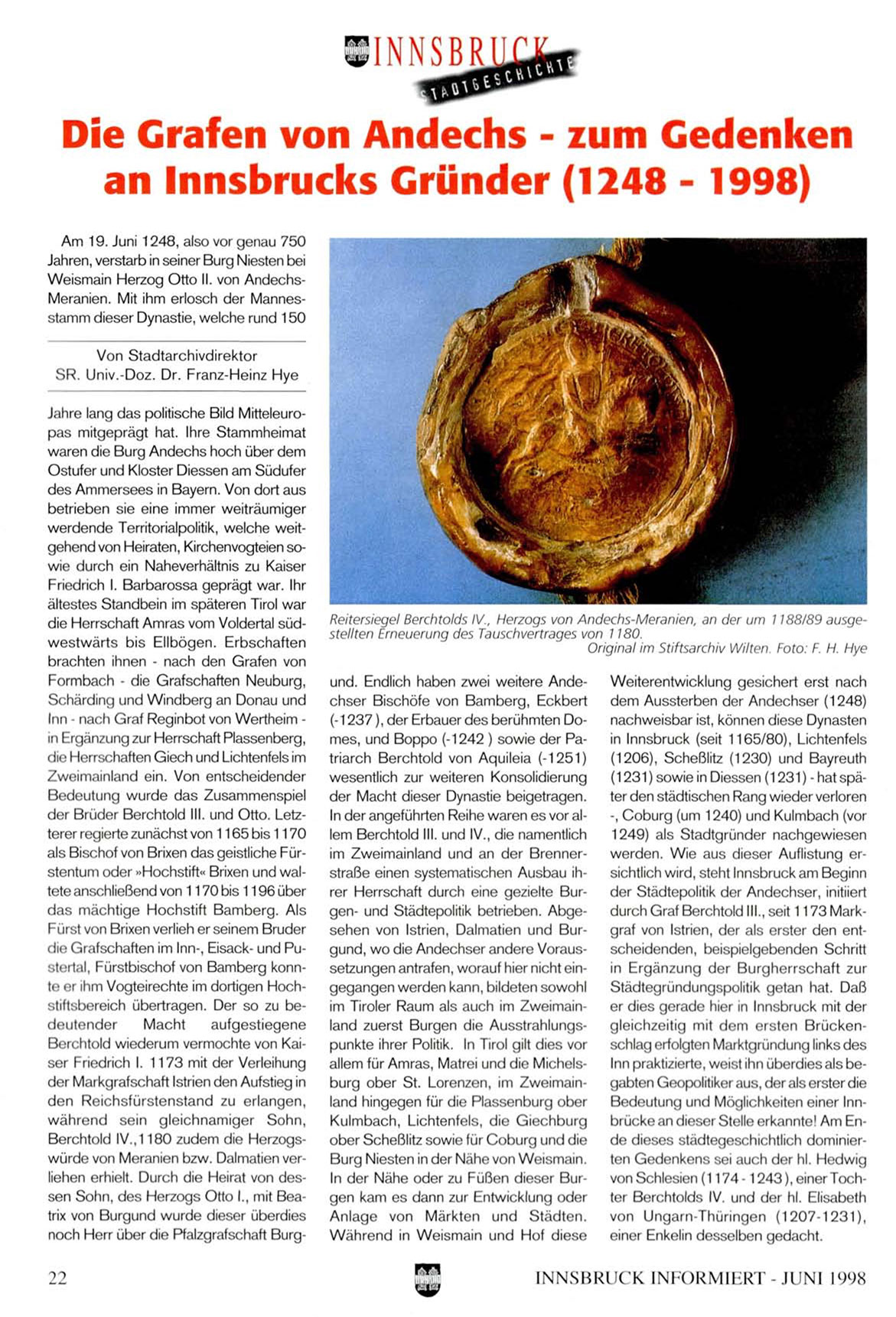 im Zweimainland und an der Brennerstraße einen systematischen Ausbau ihrer Herrschaft durch eine gezielte Burgen- und Städtepolitik betrieben. Abgesehen von Istrien, Dalmatien und Burgund, wo die Andechser andere Voraussetzungen antrafen, worauf hier nicht eingegangen werden kann, bildeten sowohl