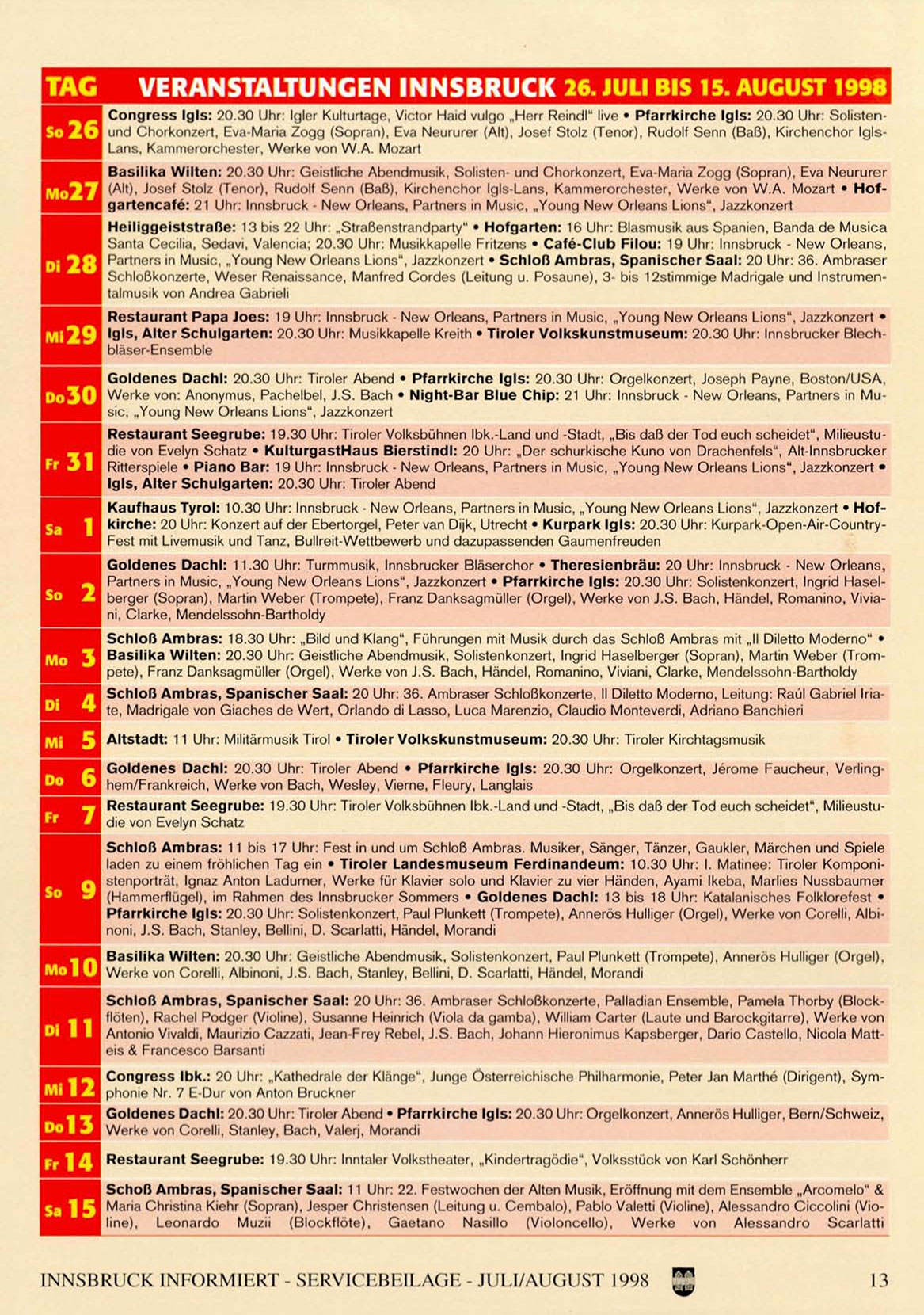 VERANSTALTUNGEN INNSBRUCK 26. JUU BIS 15. AUGUST 1998