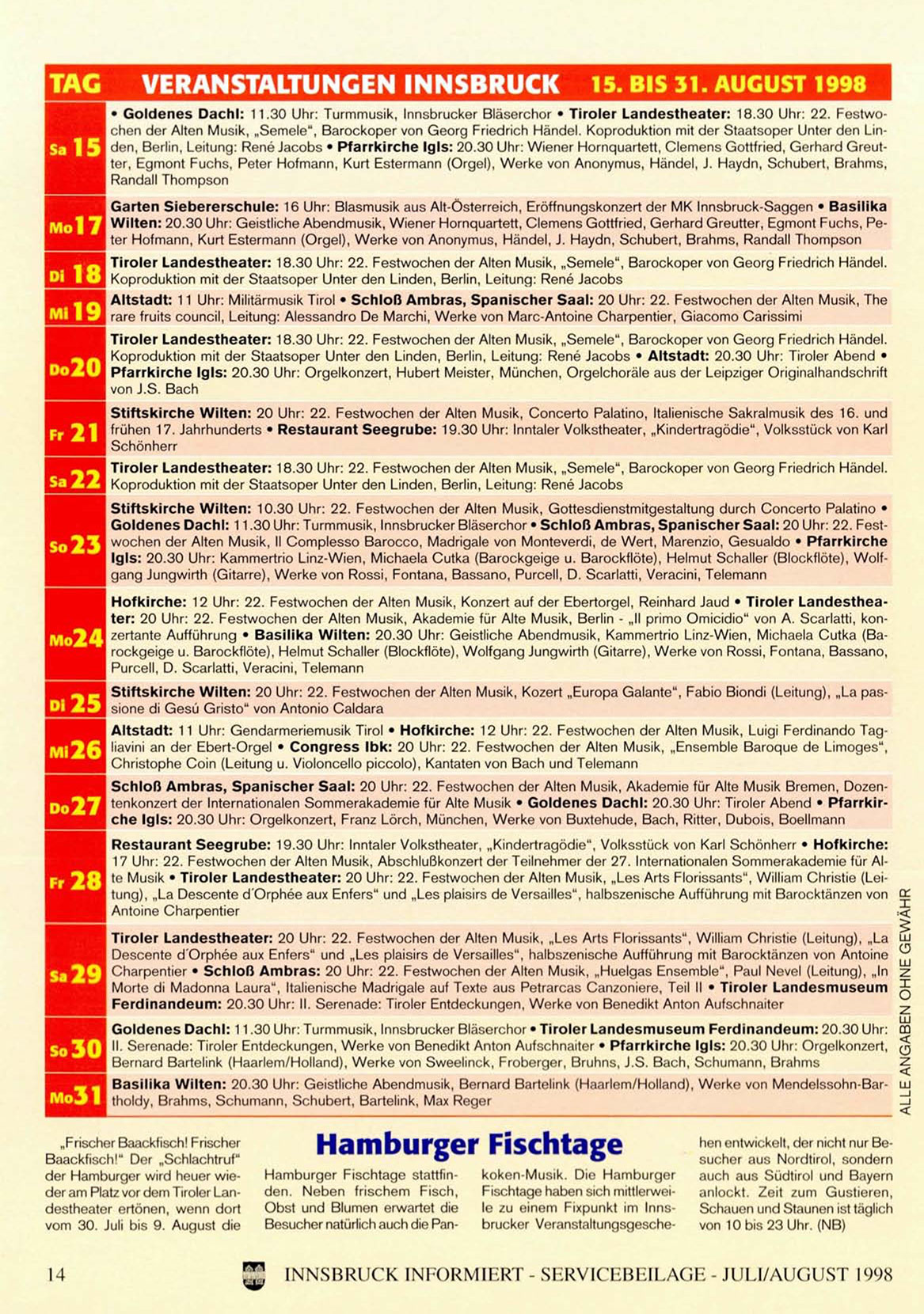 • Goldenes Dachl: 11.30 Uhr: Turmmusik, Innsbrucker Bläserchor • Tiroler Landestheater: 18.30 Uhr: 22. Festwochen der Alten Musik, „Semele", Barockoper von Georg Friedrich Händel. Koproduktion mit der Staatsoper Unter den Linden, Berlin, Leitung: Rene Jacobs • Pfarrkirche Igls: 20.30 Uhr: Wiener Hornquartett, Clemens Gottfried, Gerhard Greutter, Egmont Fuchs, Peter Hofmann, Kurt Estermann (Orgel), Werke von Anonymus, Händel, J. Haydn, Schubert, Brahms,