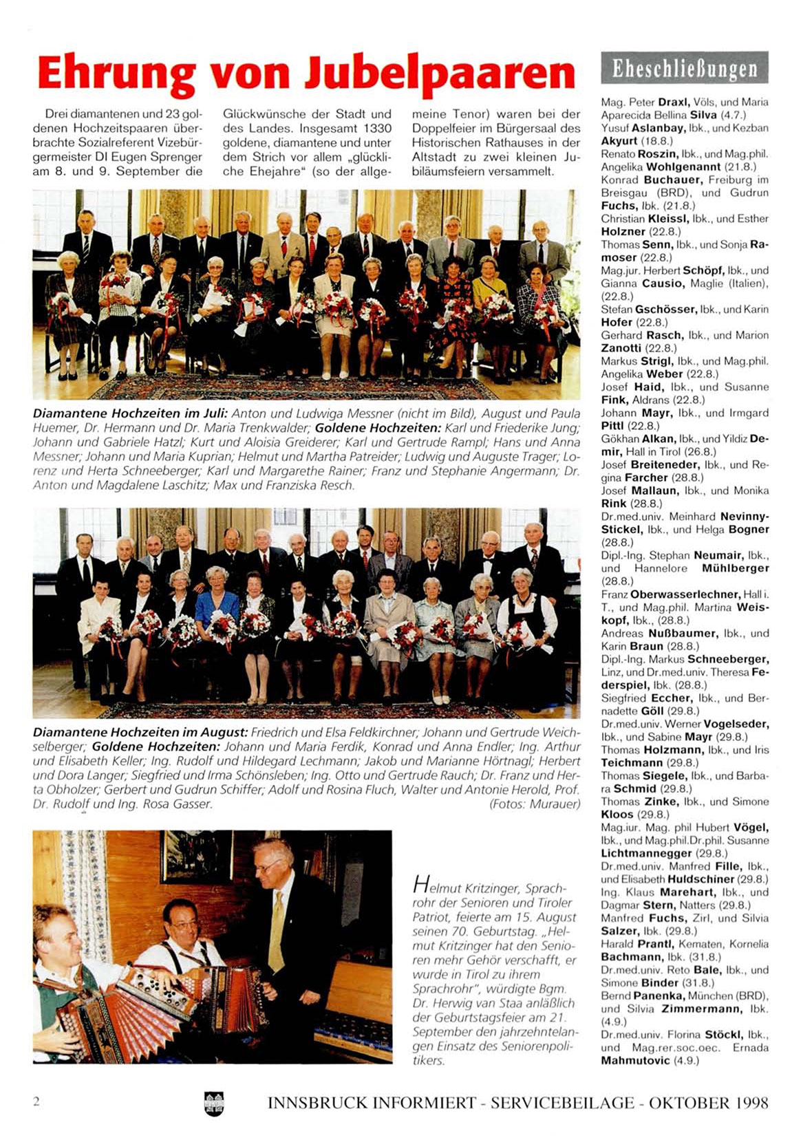 Johann und Gabriele Hatzl; Kurt und Aloisia Greiderer; Karl und Gertrude Rampl; Hans und Anna Gôkhan Alkan, Ibk., und Yildiz DeMessner; Johann und Maria Kuprian; Helmut und Martha Patreider; Ludwig und Auguste Trager; Lo-mir, Hall in Tirol (26.8.)