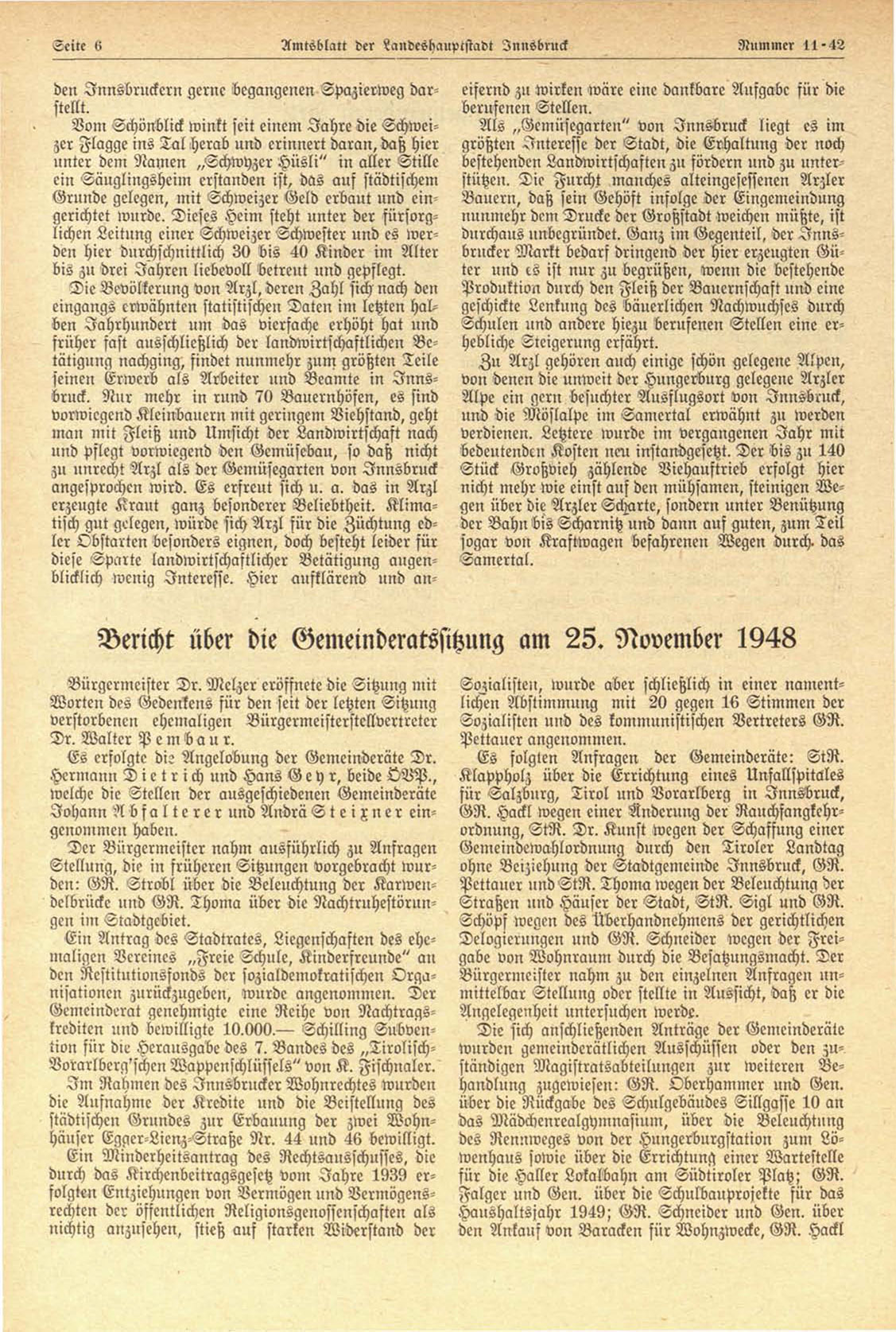 Bericht über die Gemeinderatssitzung am 25. November 1948