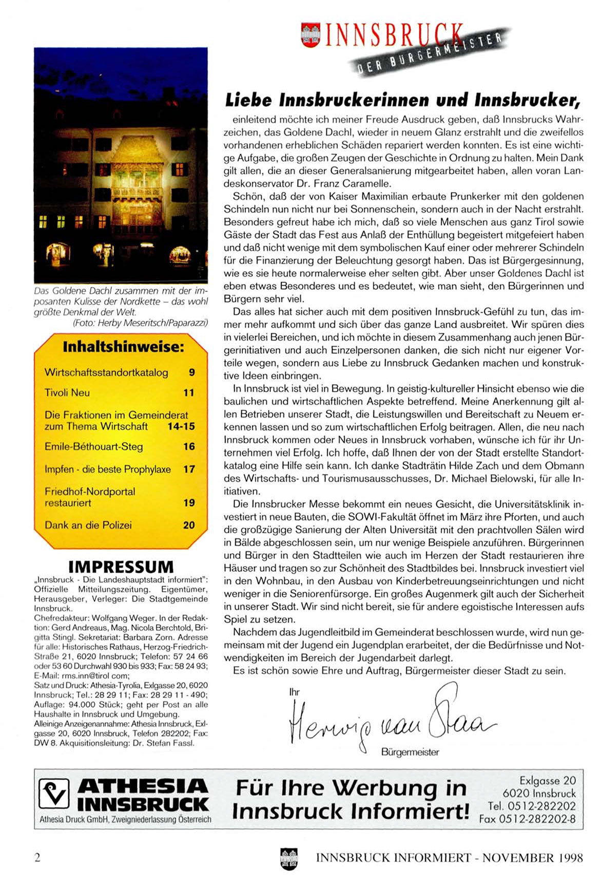 einleitend möchte ich meiner Freude Ausdruck geben, daß Innsbrucks Wahrzeichen, das Goldene Dachl, wieder in neuem Glanz erstrahlt und die zweifellos