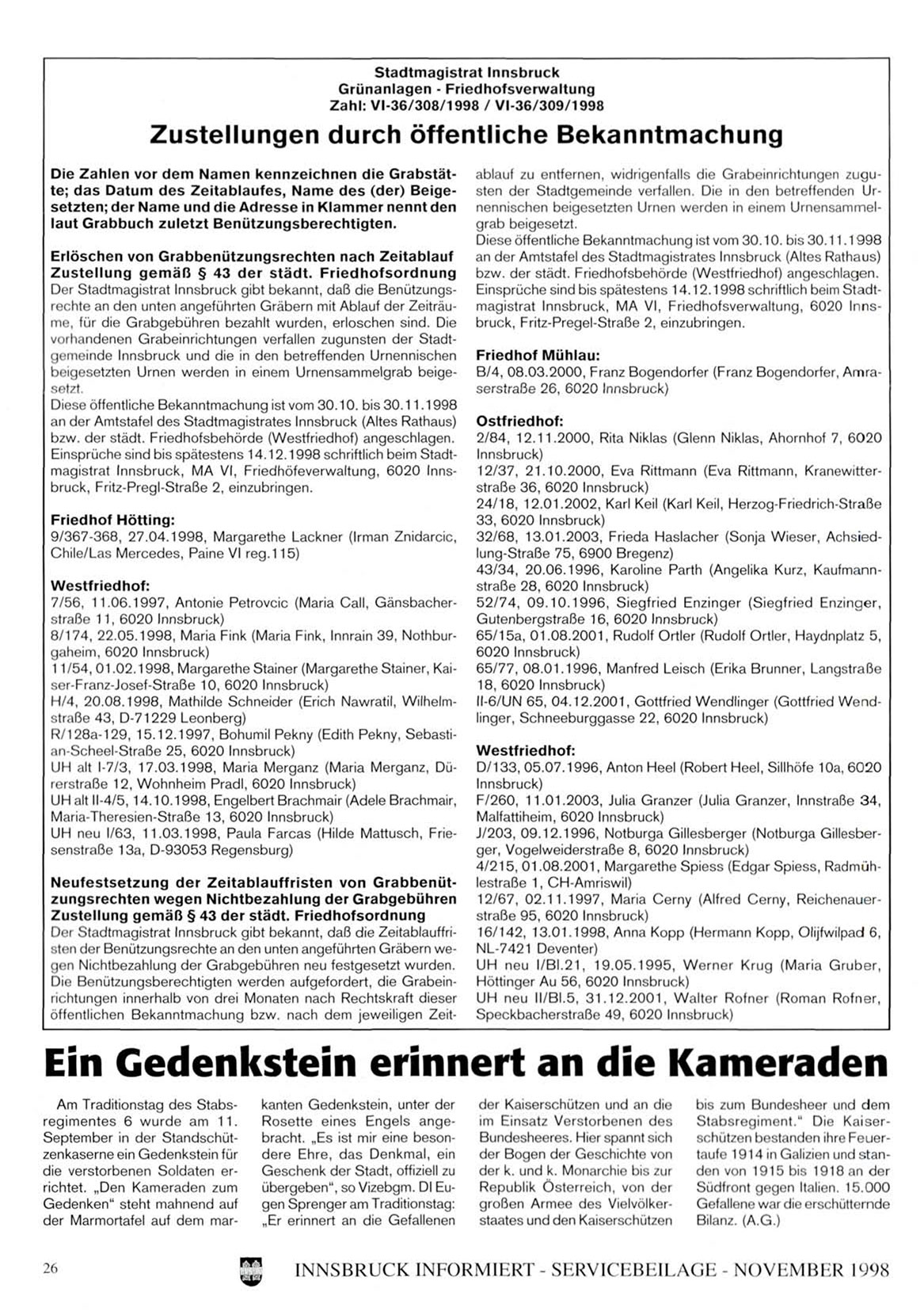 Einsprüche sind bis spätestens 14.12.1998 schriftlich beim Stadtmagistrat Innsbruck, MA VI, Friedhöfeverwaltung, 6020 Innsbruck, Fritz-Pregl-Straße 2, einzubringen.