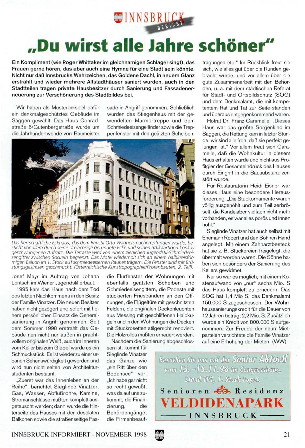 sengitter zwischen Sockeln begrenzt. Das Motiv wiederholt sich an einem halbkreisför- übermalt worden waren. Die Söhne hamigen Balkon im 7. Stock auf schmiedeeisernen Raukenträgern. Die Fenster sind mit Brüben sich besonders der Sanierung des