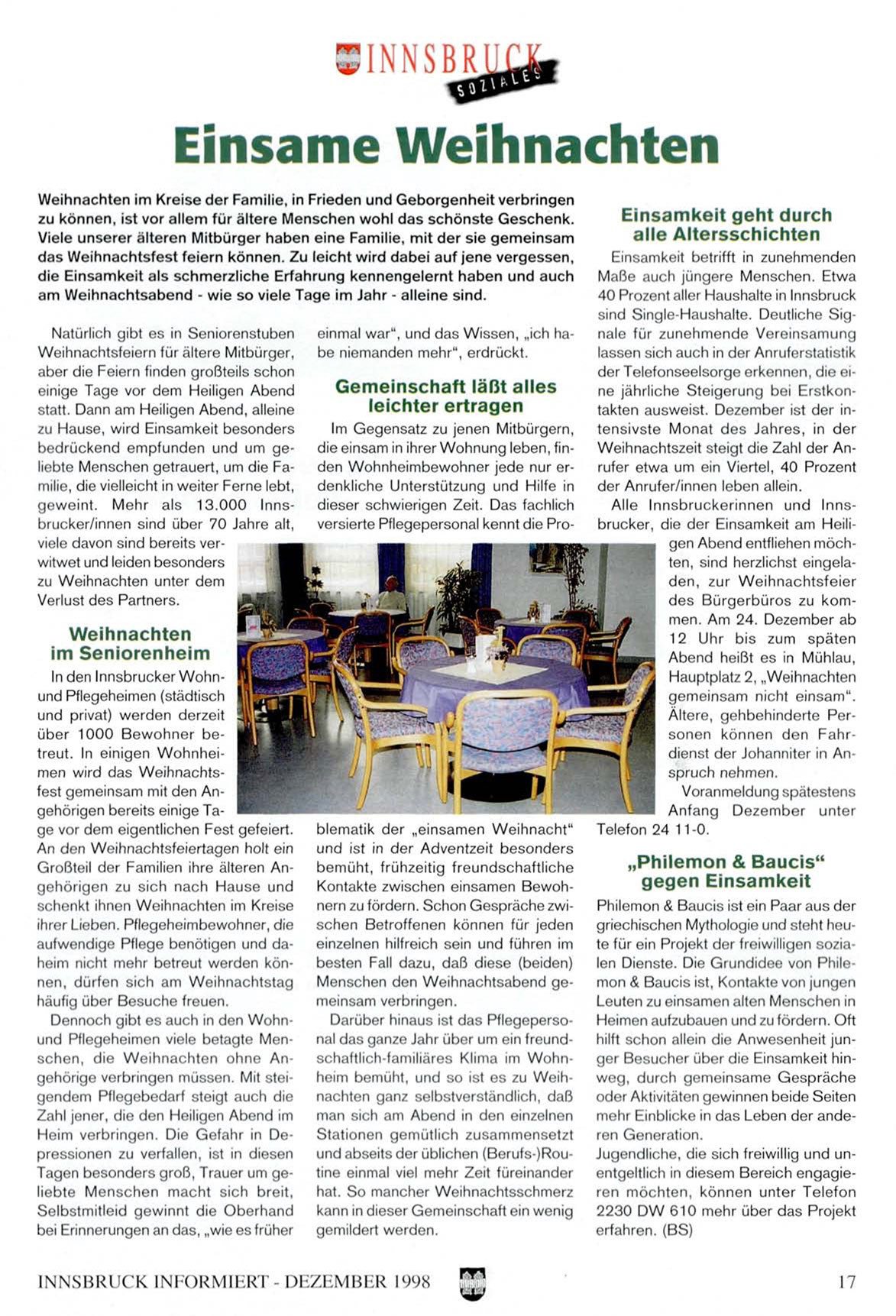 Alle Innsbruckerinnen und Innsbrucker, die der Einsamkeit am Heiligen Abend entfliehen möchten, sind herzlichst eingeladen, zur Weihnachtsfeier