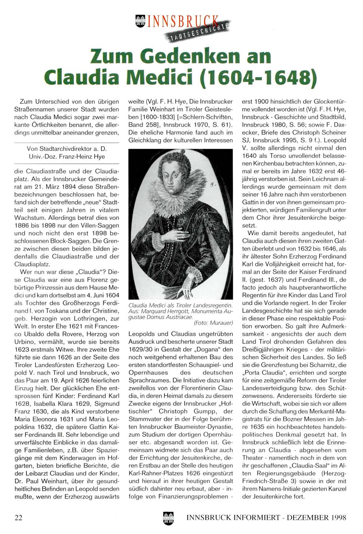 Wer nun war diese „Claudia"? Diese Claudia war eine aus Florenz gebürtige Prinzessin aus dem Hause Medioi und kam dortselbst am 4. Juni 1604