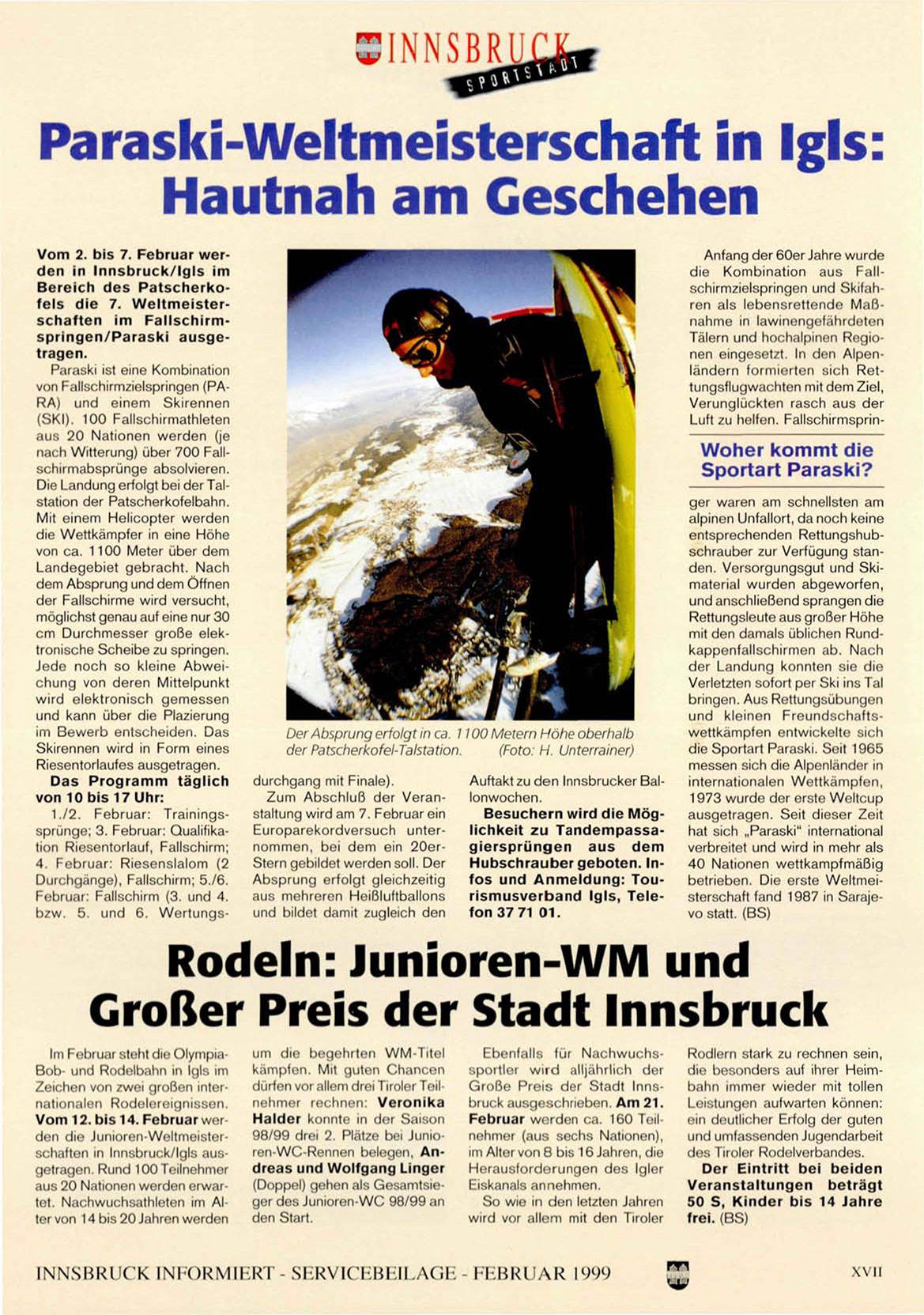 Bereich des Patscherkofels die 7. Weltmeisterschaften im Fallschirmspringen/Paraski ausgetragen.