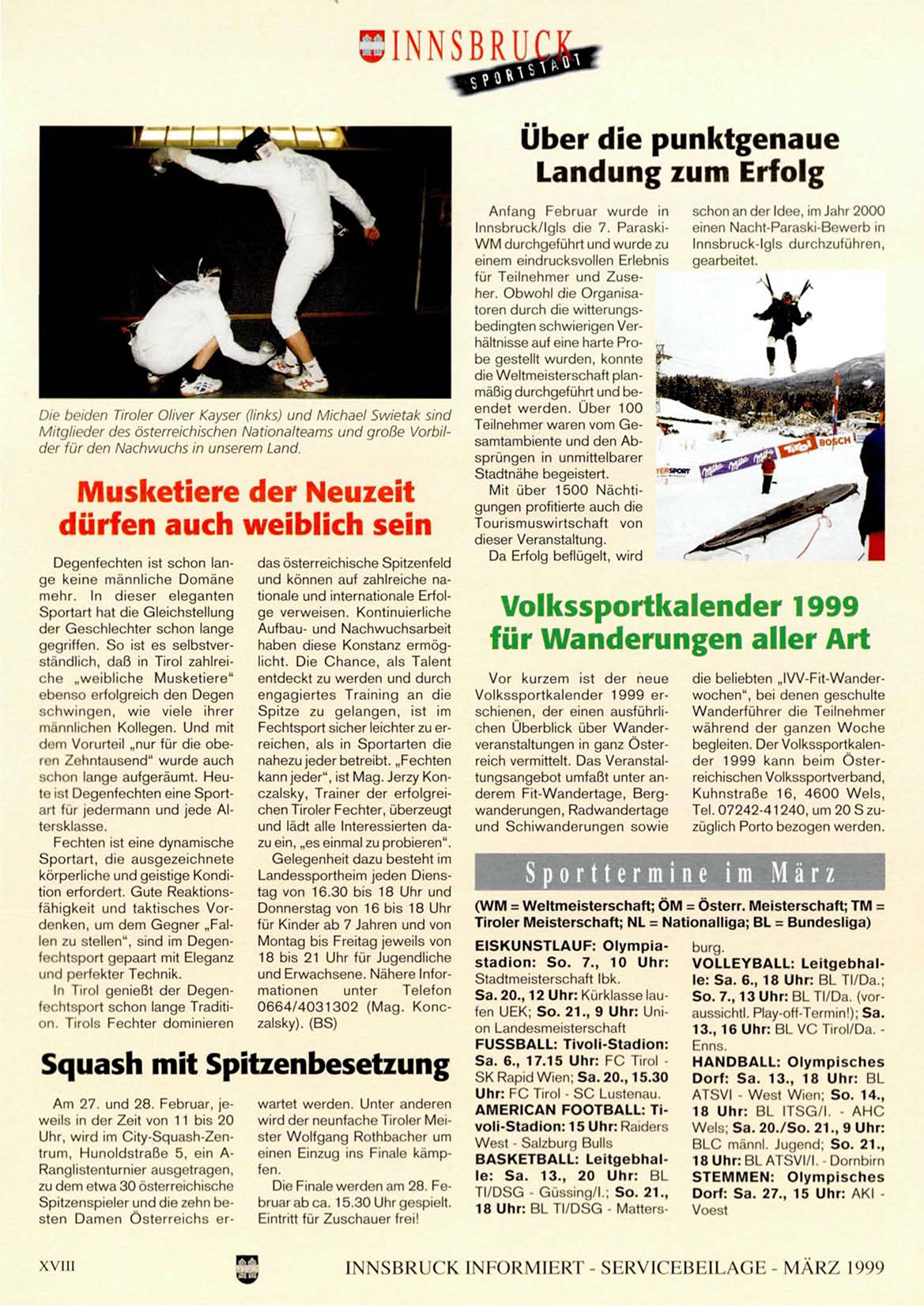 In Tirol genießt der DegenSa. 20., 12 Uhr: Kürklasse lauSo. 7., 13 Uhr: BL Tl/Da. (vor0664/4031302 (Mag. Koncfechtsport schon lange Traditifen UEK; So. 21., 9 Uhr: Uniaussichtl. Play-off-Tormin!); Sa.