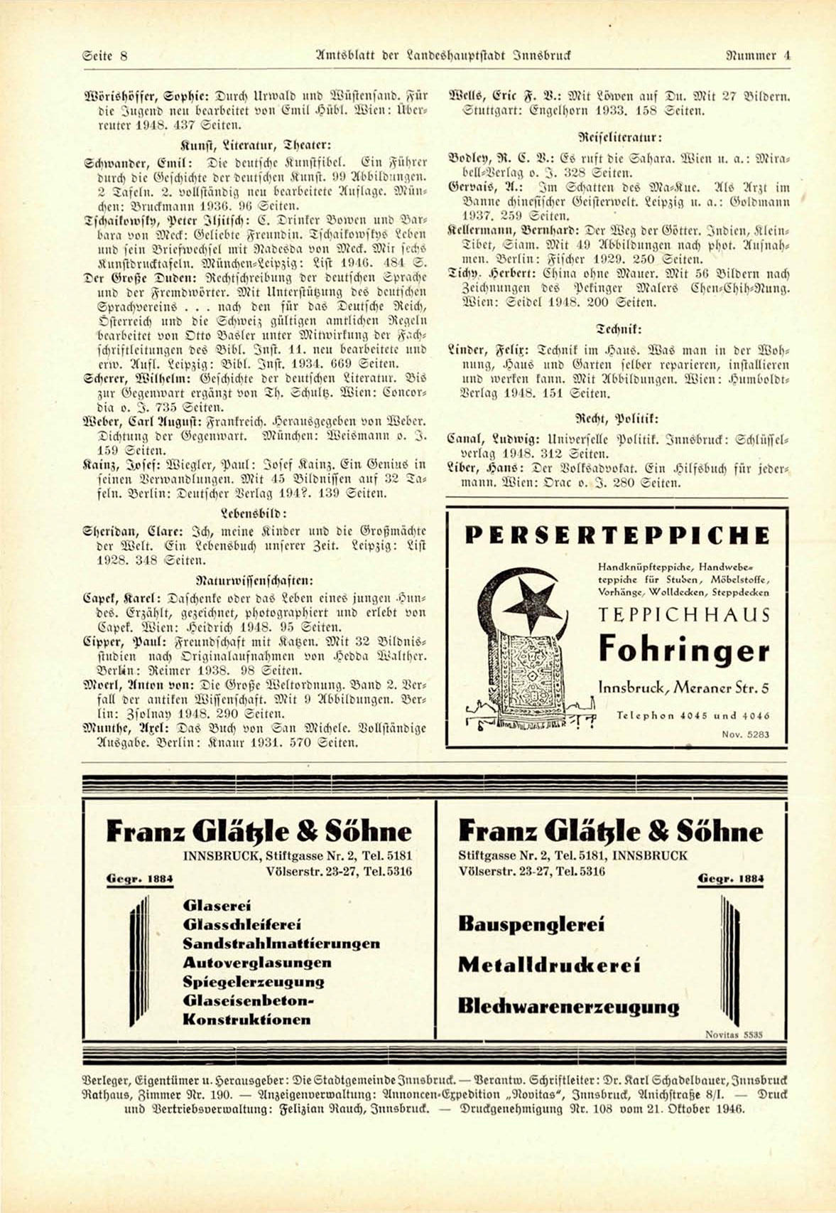 Verleger, Eigentümer u. Herausgeber : Die Stadtgemeinde Innsbruck. — Verantw. Schriftleiter : Dr. Karl Schadelbauer, Innsbruck