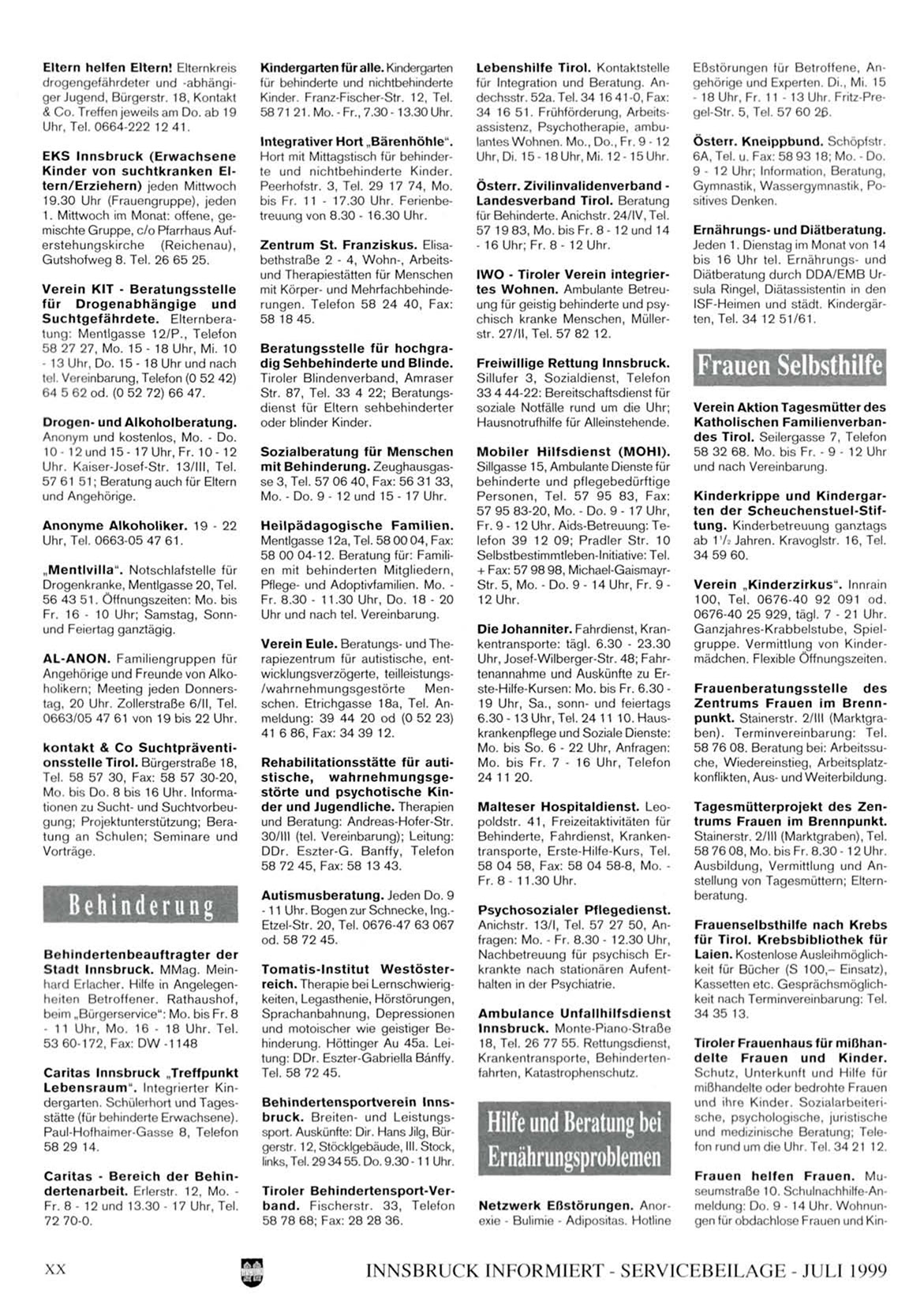 IWO - Tiroler Verein integriertes Wohnen. Ambulante Betreuung für geistig behinderte und psychisch kranke Menschen, Müllerstr. 27/II, Tel. 57 82 12.