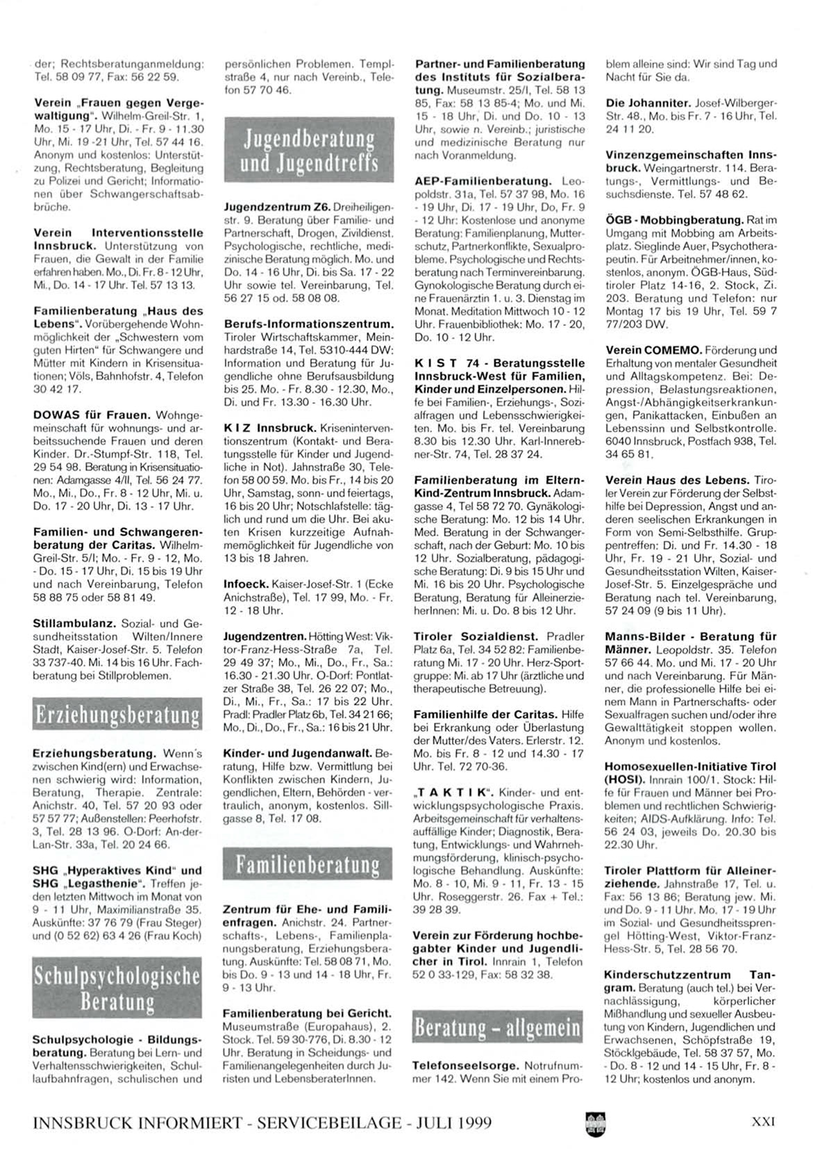 Familienberatung im ElternKind-Zentrum Innsbruck. Adamgasse 4, Tel 58 72 70. Gynäkologische Beratung: Mo. 12 bis 14 Uhr.