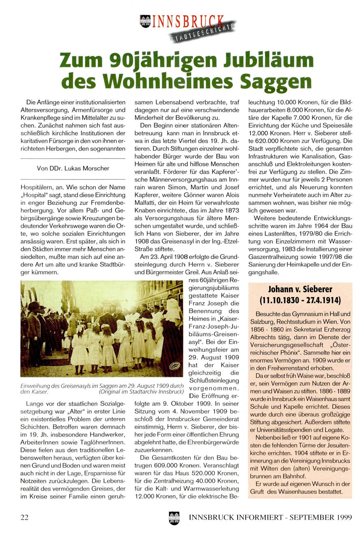 Den Beginn einer stationären Altenbetreuung kann man in Innsbruck etwa in das letzte Viertel des 19. Jh. datieren. Durch Stiftungen einzelner wohlhabender Bürger wurde der Bau von