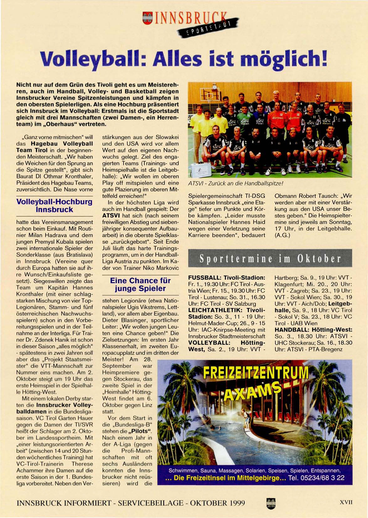 Uhr: VVT - Aich/Dob; Leitgebhalle, Sa. 9., 18 Uhr: VC Tirol