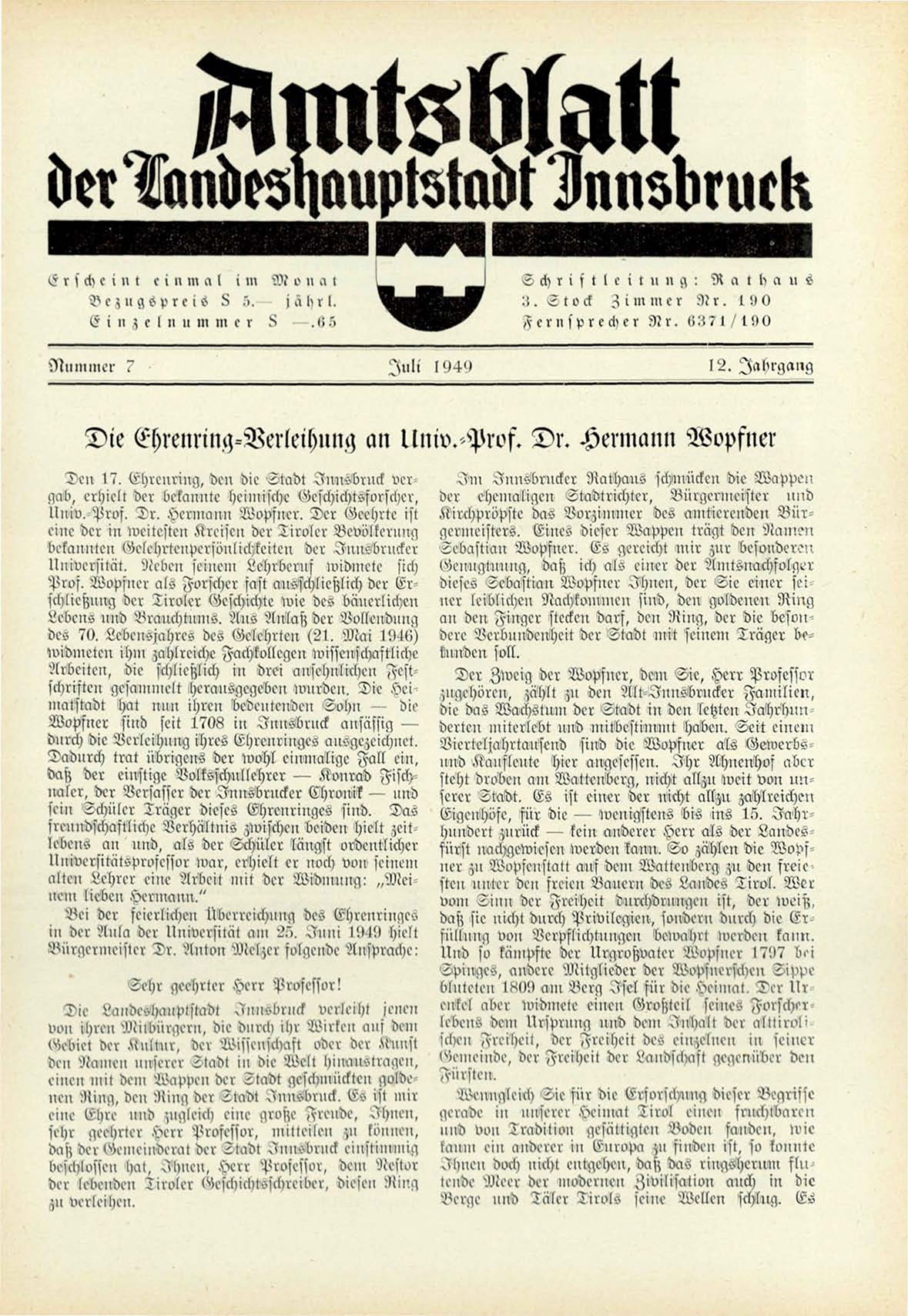 17. Ehrcuriug, «don dio Stadt Innsbruck vergab, erhielt der bekannte heiniische Geschichtsforscher,
